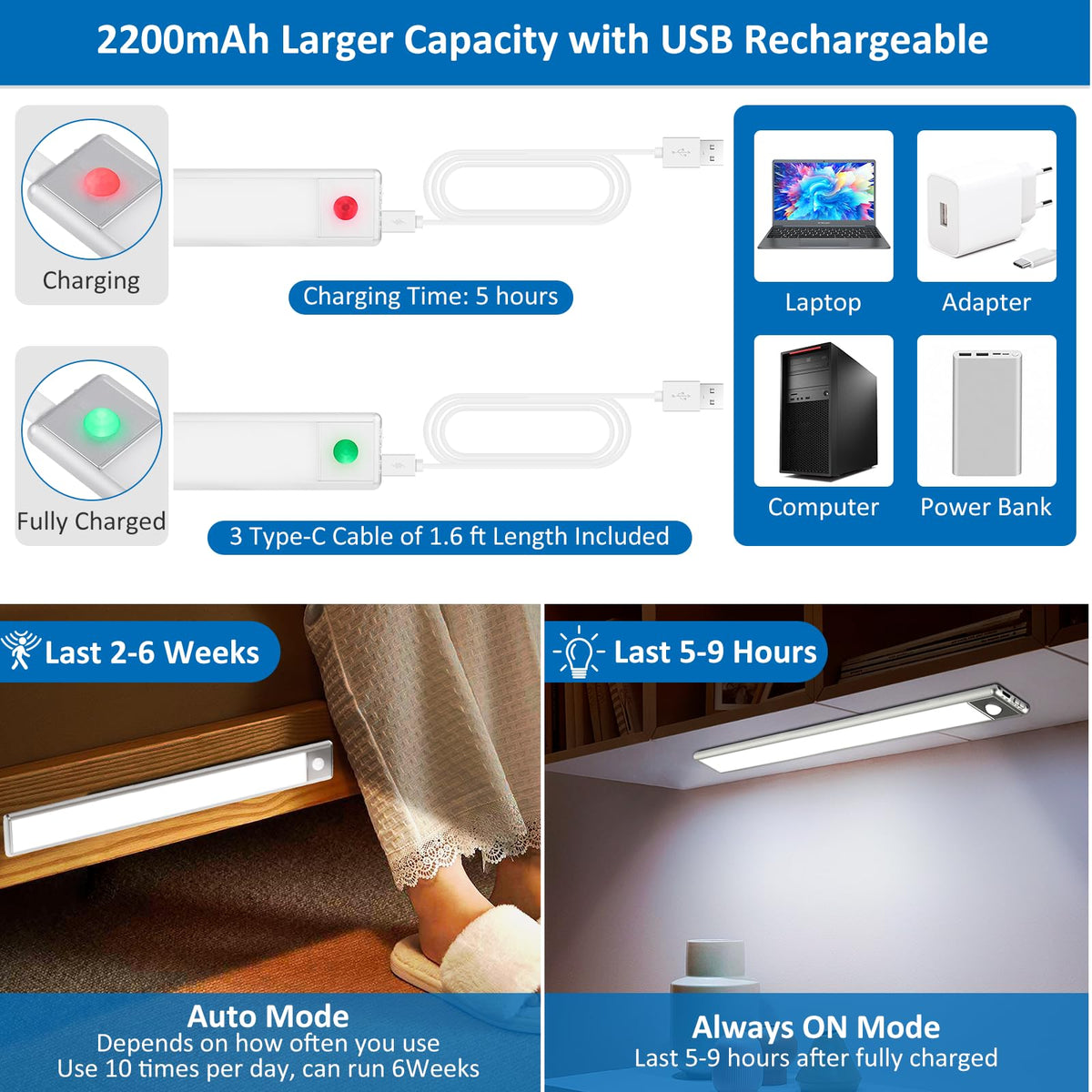 Now To Awaken Your Brightness Life! Why Choose Our Lights For Under Cabinets In Kitchen? Do You Need A Kitchen Lights Under Cabinet That Lights You Up At Night When You Go To The Toilet And Turns Off After 20 Seconds? Do You Have Such Troubles - Hard To Find Things In Dark Cabinets? Do You Need A Softer And Brighter Light That Protects Your Eyes From Dazzling Irradiation? The Under Cabinet Lights Rechargeable Can Help You Solve All The Problems! About Sensor-Activated Mode When The Environment Is Bright Enough, The Light Will Not Turn On Automatically When People Pass By. When In Dark Environment, The Light Will Turn On Automatically When People Pass By. Large Capacity Rechargeable Battery: Our Rechargeable Led Lights Has A Built-In 1500 Mah High-Capacity Rechargeable Battery, Easy Charging Via A Usb C Cable Which Is More Convenient Than Other Under Cupboard Lights. Modern Motion Sensor Light: The Motion Sensitive Under Cabinet Kitchen Lights Are Thin 0.35 Inch. Slim Design And Doesn? Take Up Too Much Space. The Length Of The Motion Activated Light Is 12 Inches, And The Color Is Silver. Widely Use: The Multifunctional Battery Operated Kitchen Light Is Very Suitable For Bedrooms, Baby Rooms, Closets, Cabinets, Corridors, Workshops, Basements, Garages, Stairwells Other Places. Product Specifications: Lifespan: 50000 Hours (Led) Sensor Range: 120?, 10Ft / 3M Interface Type: Type C Charging Time: 2 Hours The Lights Can Last 1-3 Months In Auto Mode After Fully Charged Last 6-8 Hours In Always On Mode After Fully Charged Package Contains: 2 X Rechargeable Motion Sensor Light 2 X Iron Sheet (Adhesives Included) 2 X Type-C Cable (1.6 Ft) 1 X User Manualrechargeable Battery Cabinet Lighting Led Motion Sensor Cabinet Light Indoor Counter Lighting Motion Sensor Night Light Closet Light Indoor Wireless Stair