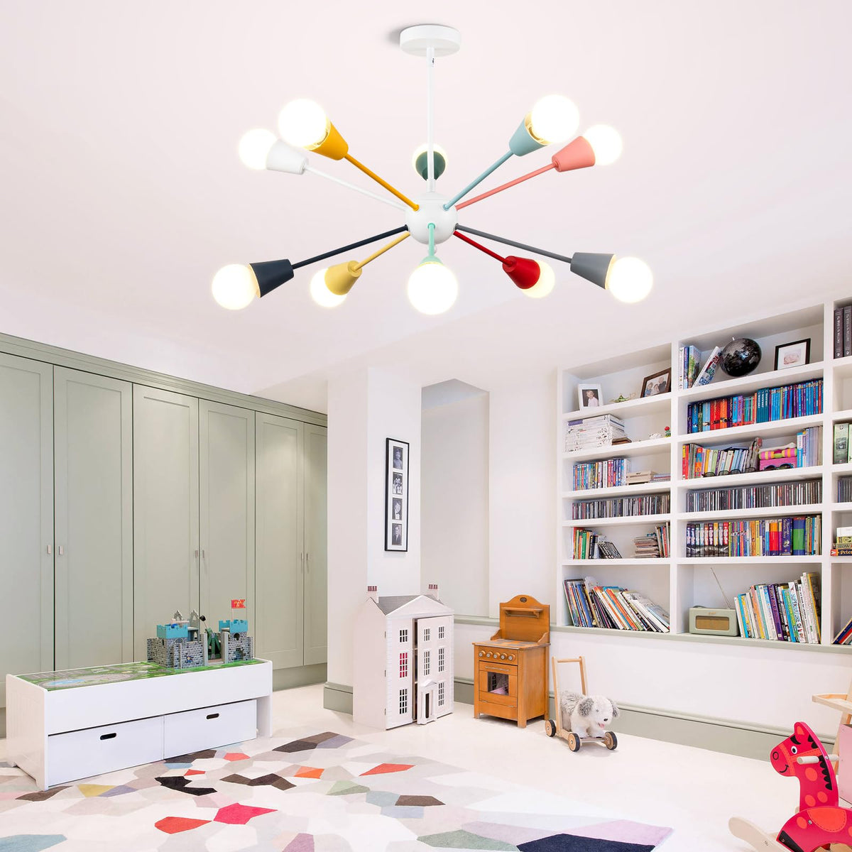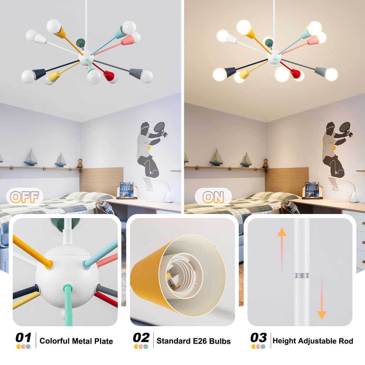 YMLII Colorful Sputnik Chandelier for Dining Room Kids Bedroom Entryway Foyer Style: Modern Material: Metal Color:Multi Color Socket: E26 Bulb Base Bulb type: including Incandescent, LED, CFL, etc(Notes: bulbs are not included). Size: Diameter:30''. Height: 18 -65'' . Wall Plate: 4.7''. Feature: Easy to Install/Height Adjustable Wide Application: Suitable for entryway, bedroom, dining room, living room, corridor, hallway, basement, balconie, bar, office, farmhouse, etc.