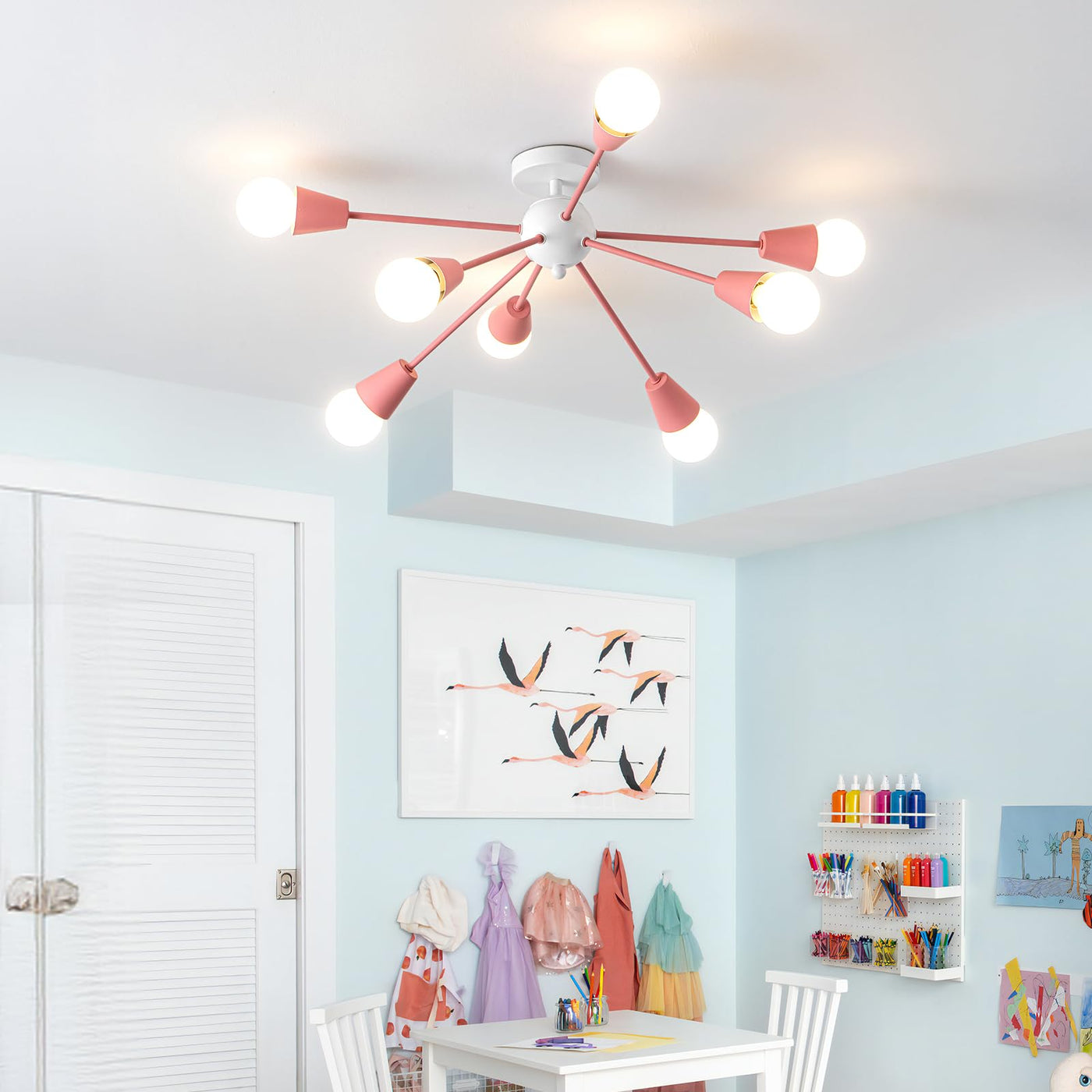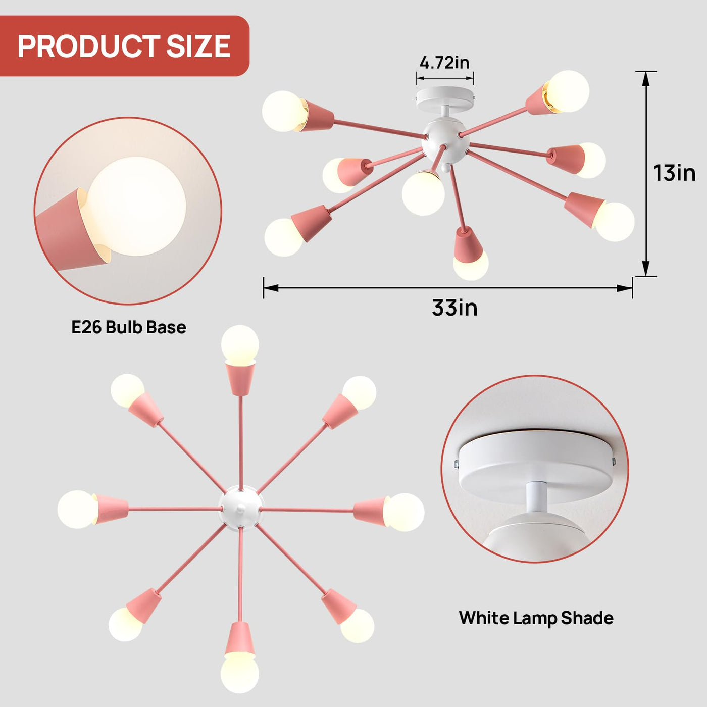 Ymlii Modern 8-Arm Sputnik Chandelier Light Fixture With Pink Metal Shades Elevate Your Space With This Stunning 8-Head Pink Ceiling Light, Blending Retro-Inspired Sputnik Design And Modern Functionality. Perfect For Living Rooms, Kitchens, Entryways, Or Even As A Playful Kids Ceiling Light, Its Soft Pink Metal Shades And Crisp White Ceiling Plate Create A Chic, Versatile Aesthetic. Key Features: Pre-Assembled & Easy Installation: Save Time With A Pre-Wired, Ready-To-Mount Design. Simply Connect To Your Ceiling Junction Box (Hardwired, 110-120V). Adjustable Ambiance: Compatible With Dimmable Bulbs (E26 Base, 60W Max Per Socket, Bulbs Not Included) To Set The Mood For Dining, Relaxing, Or Entertaining. Durable Construction: Sturdy Metal Frame And Fire-Resistant Materials Ensure Long-Lasting Performance. Spacious Coverage: 33 L X 33 W X 13 H Dimensions Provide Balanced Illumination For Medium To Large Rooms. Versatile Application: Ideal As An Entryway Light, Dining Area Centerpiece, Or A Statement Piece In Hallways, Bathrooms, And Bedrooms. The Blush-Toned Shades Add A Touch Of Warmth To Contemporary Or Vintage Decors.