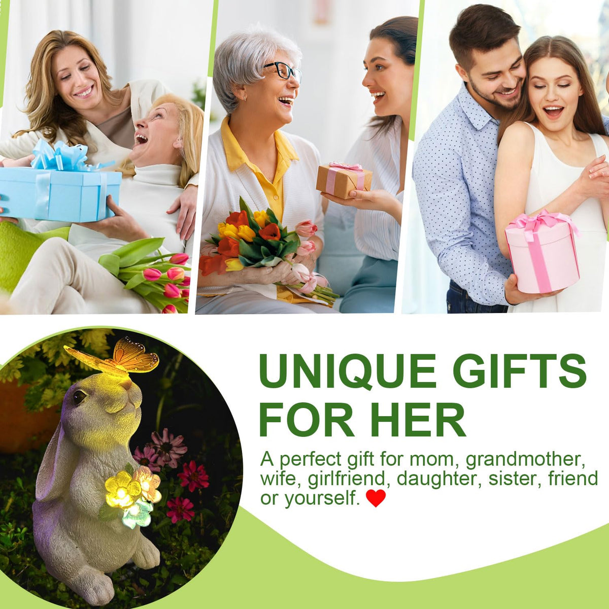 Solar Garden Statues Patio Decor- Bunny Decor For Yard Art, Lawn Ornaments, Deck, Balcony - Rabbit Figurine Holding Flowers With Led Lights And A Glowing Butterfly - Unique Garden Gifts For Women