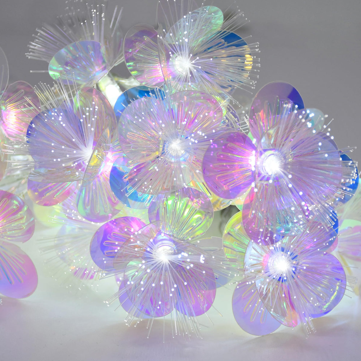 Add a subtle glow to your home with our fiber optic flower string lights. Just put in 3 AA batteries and hide the battery pack, no need for plugs! The built-in timer feature ensures that the lights automatically turn on and off at your desired time, saving energy and hassle. They would be fantastic as part of a table centerpiece, styling shelves, hanging in a nursey, draped on a mantlepiece. Iridesent fiber optic flower lights 20 delicate blossoms connect to a clear cable and are illumniated by white LEDs to create a stunning display, whether clusted in a vase, draped over a mirror or hung across window or wall. Indoor or Outdoor With water-resistant battery pack and LED light string, these battery-operated flower light garlands are sure to a add floral finish to any indoor or outdoor space. The iridenscent flowers create a mesmerizing effect, while the colorful fiber optic LED filament adds a charming glow, making them ideal decoration for party, wedding, Easter, Christmas, housewarming or any other events. Specification Length: 13ft LED Qty: 20 LED Flower Size: 2.36 inch Mode: Combination, In Waves, Sequential, Slow Glow, Chasing, Slow Fade, Flash, Steady On Timer: 2 hours / 4 hours / 6 hours / 8 hours on Remote: Infrared (require line of sight)