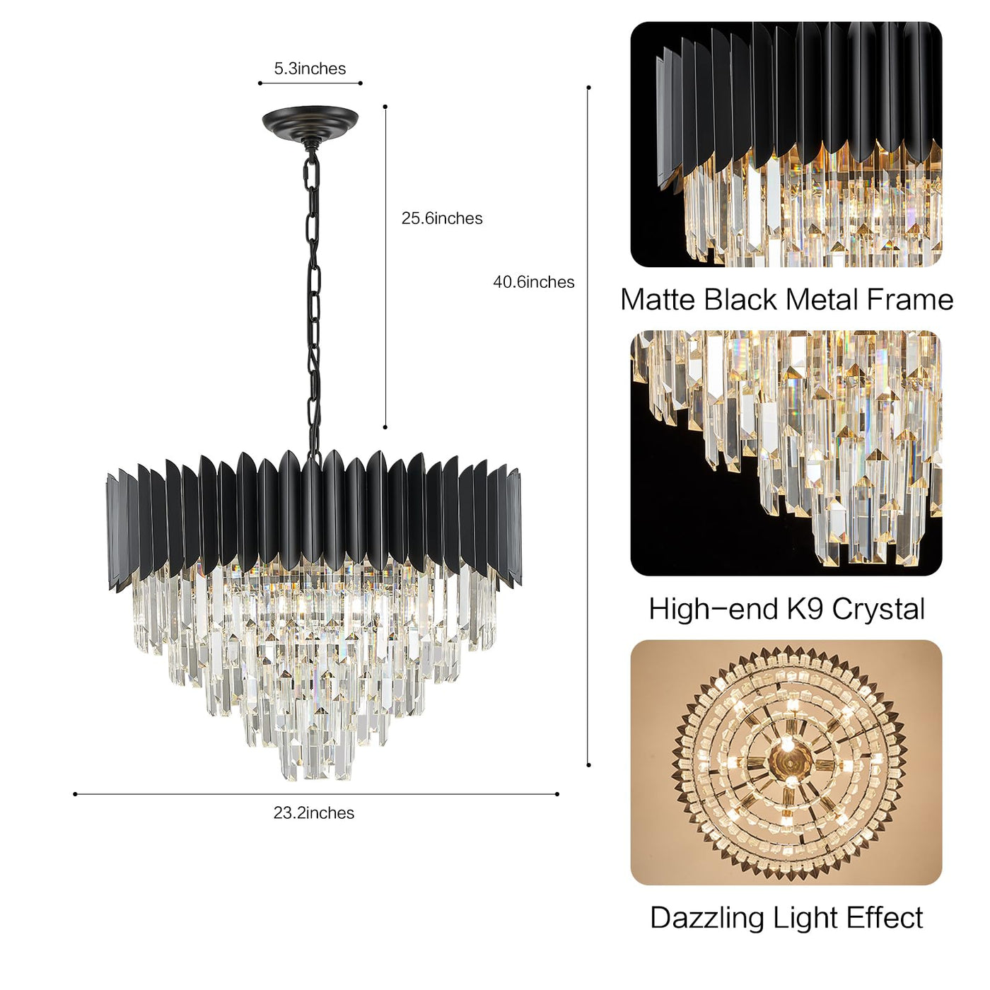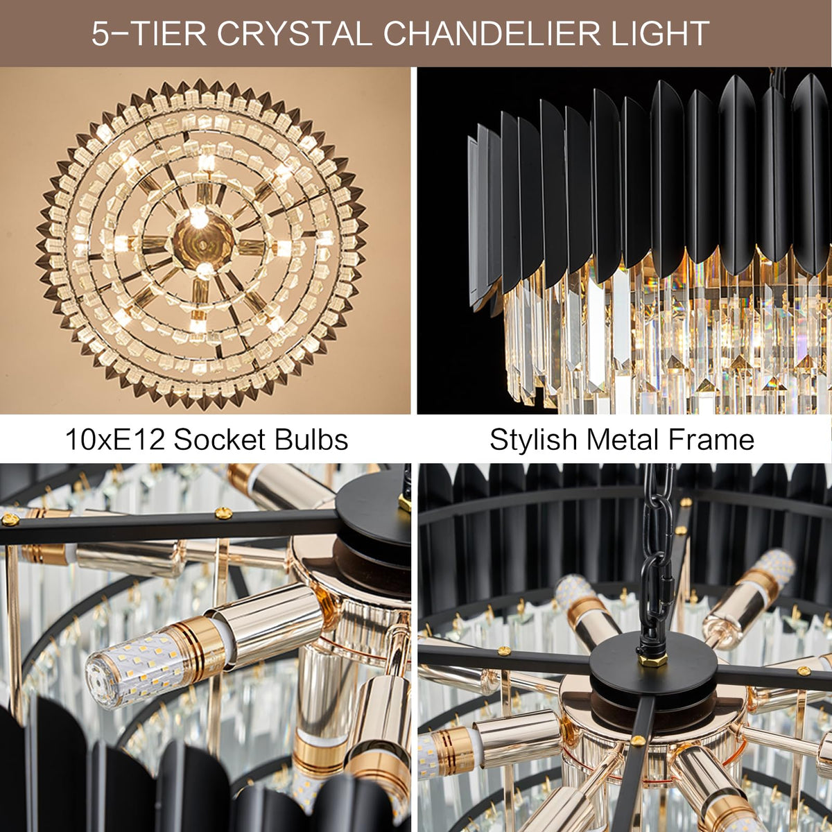 Yolizuot Black Crystal Chandelier 24'' K9 Crystal Round Pendant Lights Adjustable 5-Tier Large Modern Crystal Chandelier Light 1