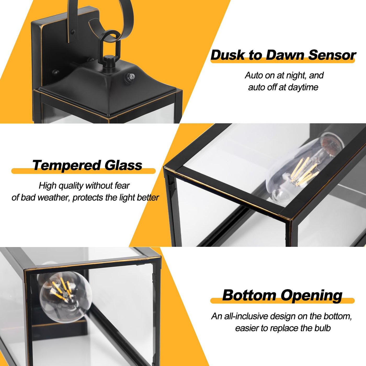 - **Automatic & Manual Modes**: Equipped with a high-sensitivity light sensor, this outdoor wall light automatically turns on at dusk and off at dawn, enhancing convenience and energy efficiency. For manual control, simply use the included rubber cap to cover the sensor and operate via wall switch.