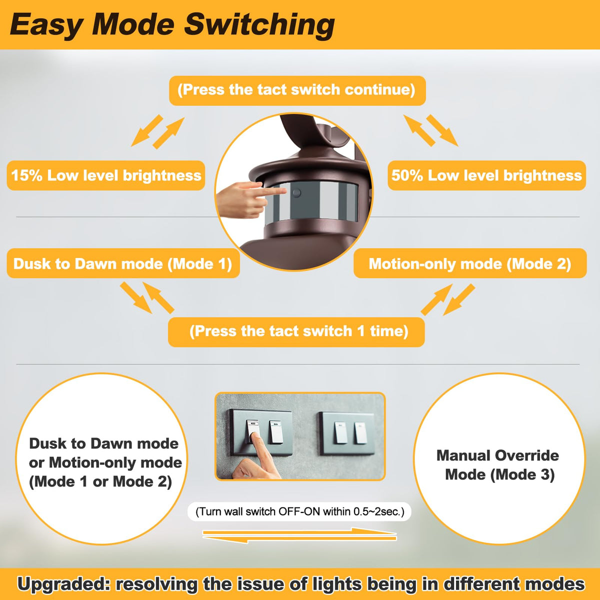 Q: What are the lighting modes available for the Yolsunes Large Motion Sensor Outdoor Wall Light?A: The Yolsunes Large Motion Sensor Outdoor Wall Light features three lighting modes: 1. Dusk-to-Dawn Mode, which provides adjustable dim light at night and activates to full brightness when motion is detected; 2. Motion-Only Mode, which remains off at night and illuminates fully upon detecting motion; and 3. Manual Override Mode, which keeps the light at full brightness throughout the night.