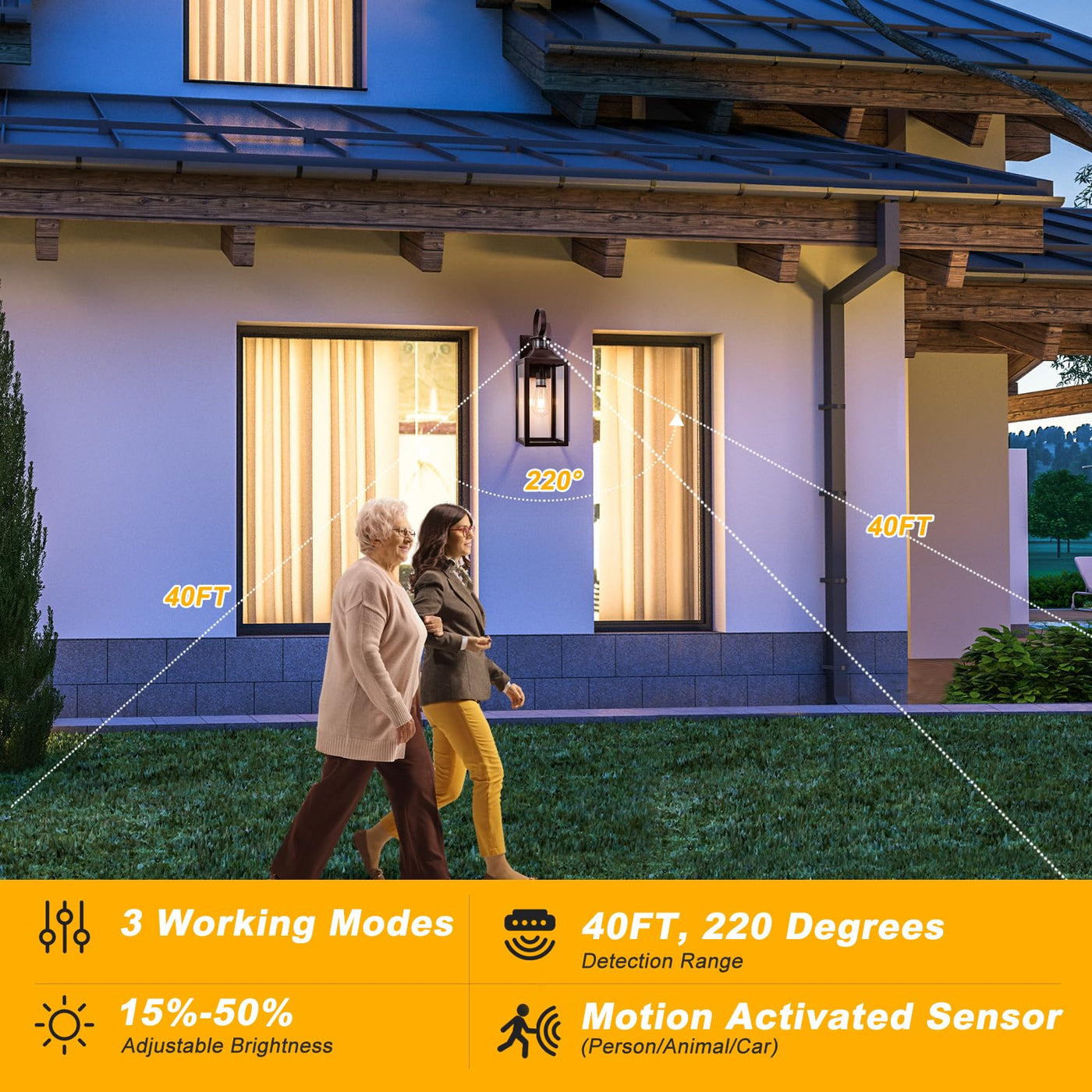 Q: What is the detection range of the motion sensor in this wall light?A: The motion sensor in the Yolsunes outdoor wall light has an extra-wide detection range of 40 feet and covers an angle of 220 degrees. This ensures that it effectively detects motion, providing enhanced security for your outdoor spaces.
