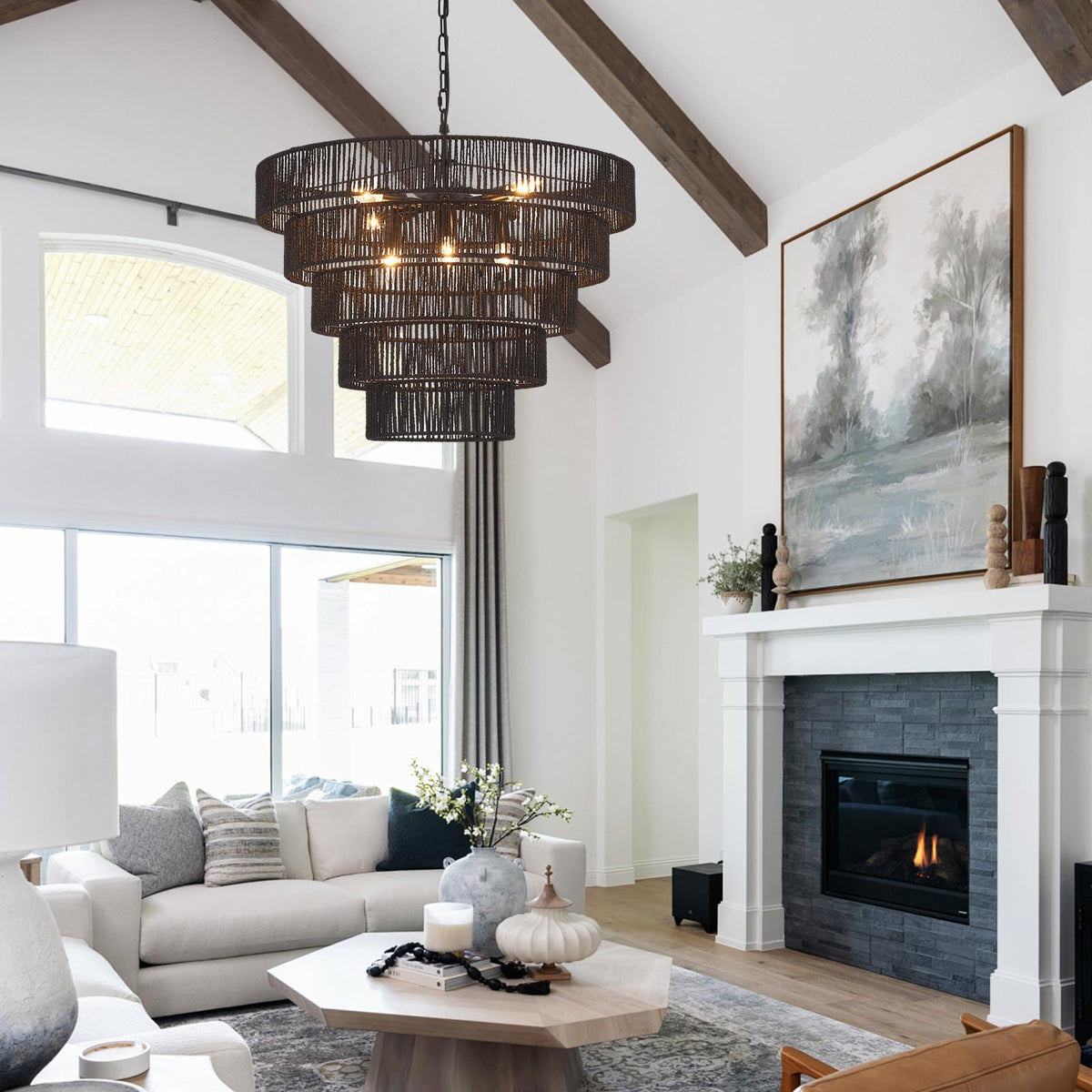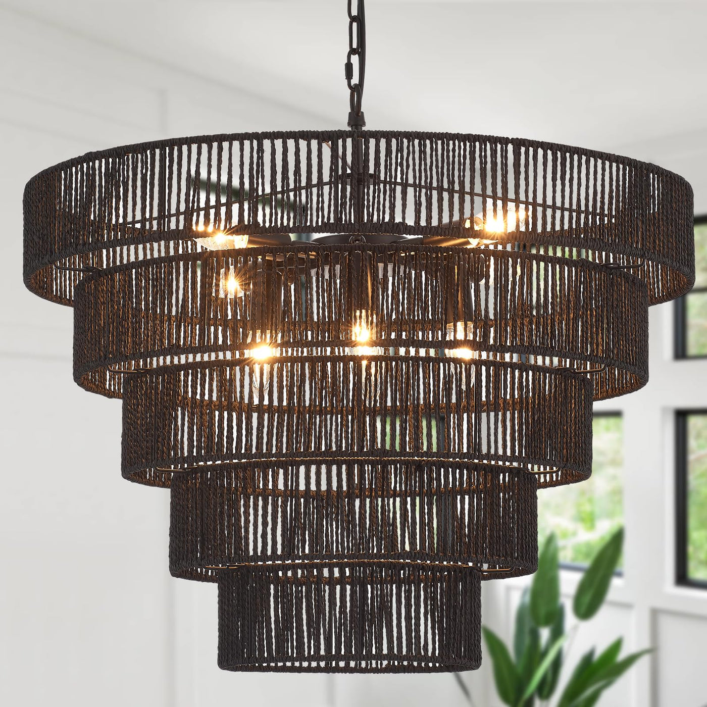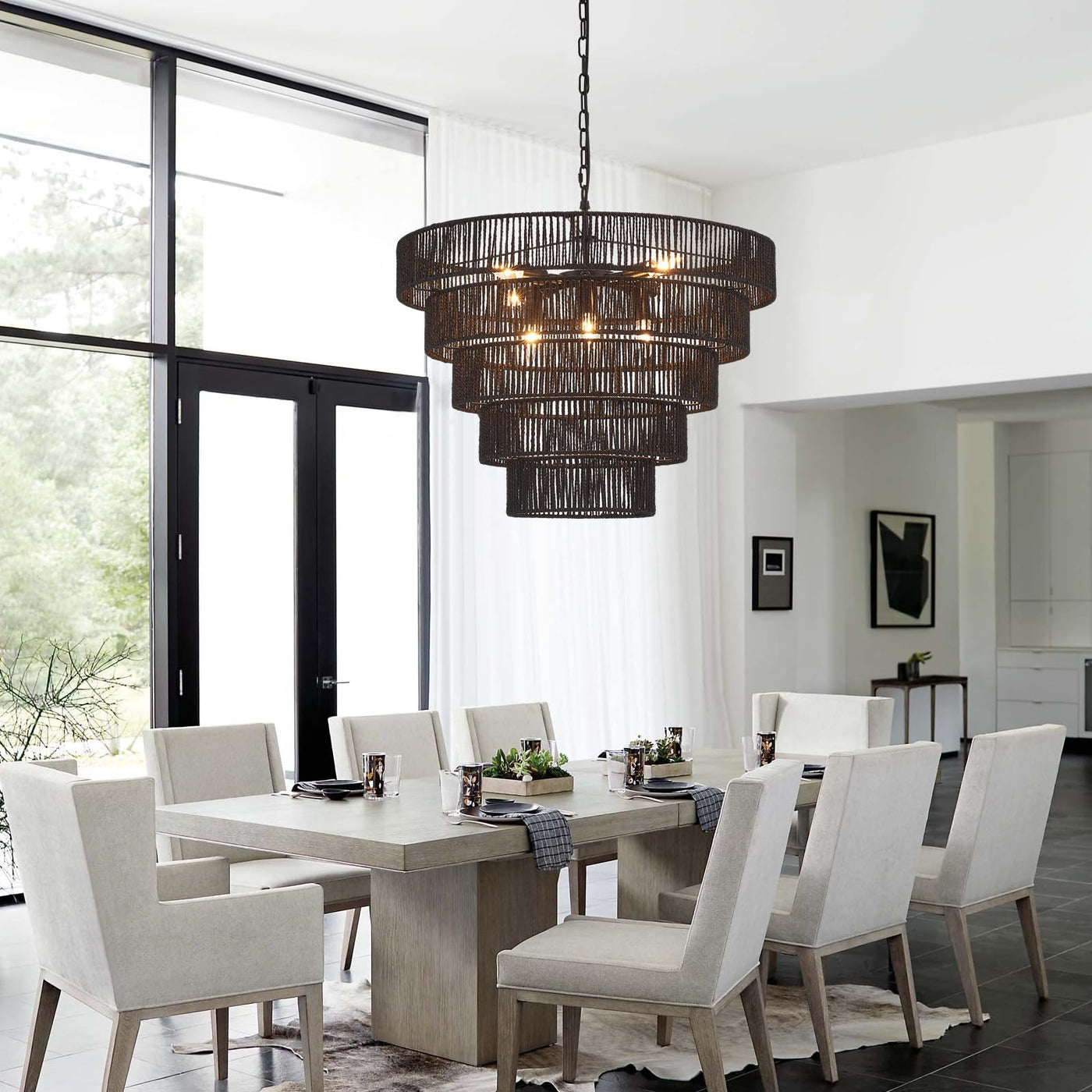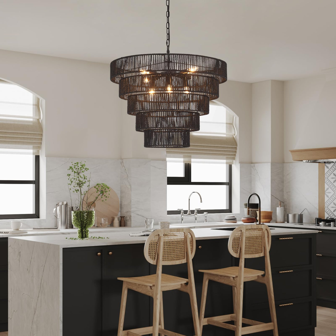 Yomecoo 25.6'' Large Black Rattan Chandelier Farmhouse 8-Lights Boho Hand Woven Bamboo Black Chandeliers Light Fixture Rustic Dr