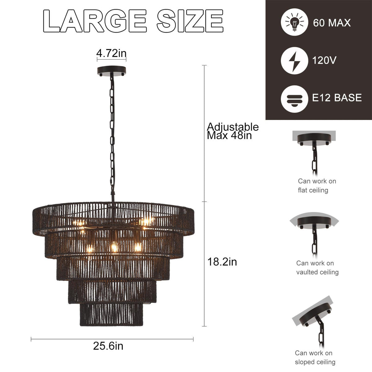 The Black Rattan Chandelier Crafted With Meticulous Attention To Detail, This Exquisite Lighting Fixture Marries The Timeless Beauty Of Wicker Rattan With The Contemporary Allure Of A Black Finish. Create An Inviting, Warm Ambiance In Your Home While Making A Statement With Our Vintage Boho Rattan Chandelier. Our Rattan Chandelier Is A True Masterpiece, Showcasing The Artistry Of Rattan Weaving. Expertly Handcrafted, Each Piece Features A Seamless, Delicate Weave That Captures The Essence Of Nature, Giving Your Home A Rustic, Yet Sophisticated Appeal. The Bamboo Black Chandelier Boasts Durability And Longevity. Its Four Round Metal Frames Provide Stability, Ensuring That Your Chandelier Maintains Its Shape And Beauty For Years To Come.The Chandelier'S Elegant, Matte Black Finish Effortlessly Complements Any Decor Style. Whether Your Home Is Modern, Classic, Or Eclectic, This Chandelier Will Effortlessly Blend In While Adding A Touch Of Bohemian Chic. The Chandelier'S Semicircular Hollow Cage Design Creates A Stunning Visual Effect When Illuminated. As Light Passes Through The Simple Rattan Weave, It Casts Mesmerizing Patterns Across Your Room, Adding Depth And Character To Your Space. The Combination Of Rattan'S Rustic Charm And The Classic Black Finish Captures The Retro And Modern Style, Making It An Ideal Addition To Your Eclectic Interior. This Chandelier Is Not Just A Light Fixture; It'S A Work Of Art That Instantly Elevates Your Decor. Whether You Hang It Above Your Dining Table, In The Living Room, Or A Cozy Nook, It'S Sure To Become The Focal Point Of Your Space. This Rattan Chandelier Is Suitable For Various Rooms. Install It In Your Bedroom For A Touch Of Romance, In The Kitchen For A Rustic Flair, Or In The Entryway For A Warm Welcome.The Intricate Rattan Weave Diffuses Light Beautifully, Casting A Soft And Inviting Glow That'S Perfect For Relaxation And Creating A Warm Atmosphere For Gatherings. Our Chandelier Comes With All The Necessary Hardware For A Straightforward Installation Process. We Take Pride In Offering A High-Quality Product. The Black Chandelier Light Fixture Has Been Designed To Meet Our Stringent Standards For Craftsmanship And Performance. We'Re Confident It Will Meet And Exceed Your Expectations.