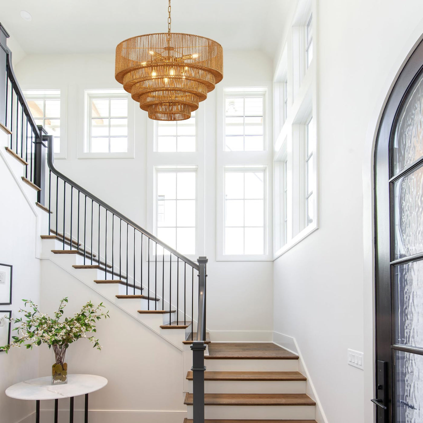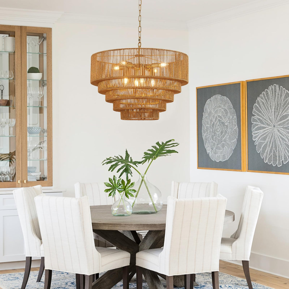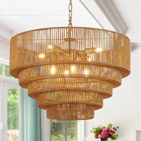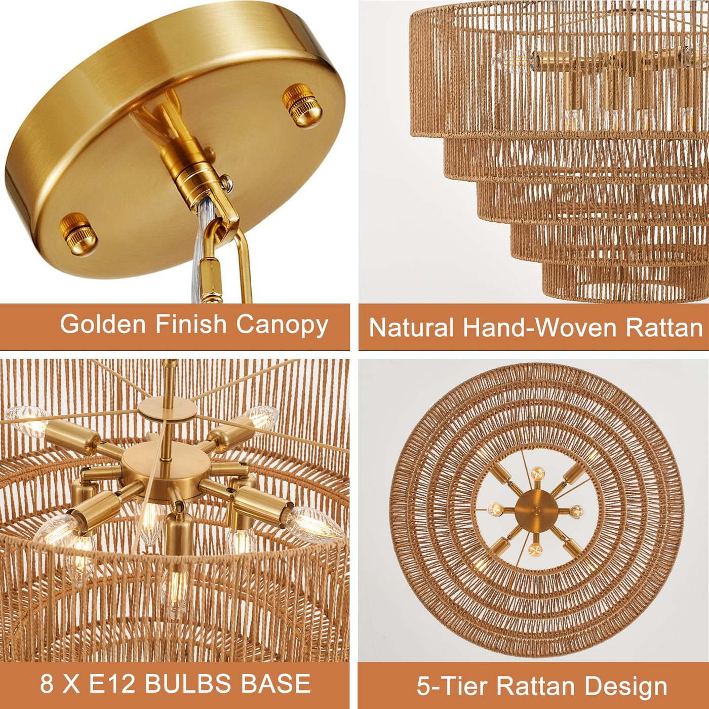 The Rattan Chandelier Crafted With Meticulous Attention To Detail, This Exquisite Lighting Fixture Marries The Timeless Beauty Of Wicker Rattan With The Contemporary Allure Of A Gold Finish. Create An Inviting, Warm Ambiance In Your Home While Making A Statement With Our Vintage Boho Rattan Chandelier. Our Rattan Chandelier Is A True Masterpiece, Showcasing The Artistry Of Rattan Weaving. Expertly Handcrafted, Each Piece Features A Seamless, Delicate Weave That Captures The Essence Of Nature, Giving Your Home A Rustic, Yet Sophisticated Appeal. The Bamboo Chandelier Dining Room Boasts Durability And Longevity. Its Four Round Metal Frames Provide Stability, Ensuring That Your Chandelier Maintains Its Shape And Beauty For Years To Come.The Chandelier'S Elegant, Matte Gold Finish Effortlessly Complements Any Decor Style. Whether Your Home Is Modern, Classic, Or Eclectic, This Chandelier Will Effortlessly Blend In While Adding A Touch Of Bohemian Chic. The Chandelier'S Semicircular Hollow Cage Design Creates A Stunning Visual Effect When Illuminated. As Light Passes Through The Simple Rattan Weave, It Casts Mesmerizing Patterns Across Your Room, Adding Depth And Character To Your Space. The Combination Of Rattan'S Rustic Charm And The Classic Gold Finish Captures The Retro And Modern Style, Making It An Ideal Addition To Your Eclectic Interior. This Chandelier Is Not Just A Light Fixture; It'S A Work Of Art That Instantly Elevates Your Decor. Whether You Hang It Above Your Dining Table, In The Living Room, Or A Cozy Nook, It'S Sure To Become The Focal Point Of Your Space. This Rattan Chandelier Is Suitable For Various Rooms. Install It In Your Bedroom For A Touch Of Romance, In The Kitchen For A Rustic Flair, Or In The Entryway For A Warm Welcome.The Intricate Rattan Weave Diffuses Light Beautifully, Casting A Soft And Inviting Glow That'S Perfect For Relaxation And Creating A Warm Atmosphere For Gatherings. Our Chandelier Comes With All The Necessary Hardware For A Straightforward Installation Process. We Take Pride In Offering A High-Quality Product. The Rattan Chandelier Light Fixture Has Been Designed To Meet Our Stringent Standards For Craftsmanship And Performance. We'Re Confident It Will Meet And Exceed Your Expectations.