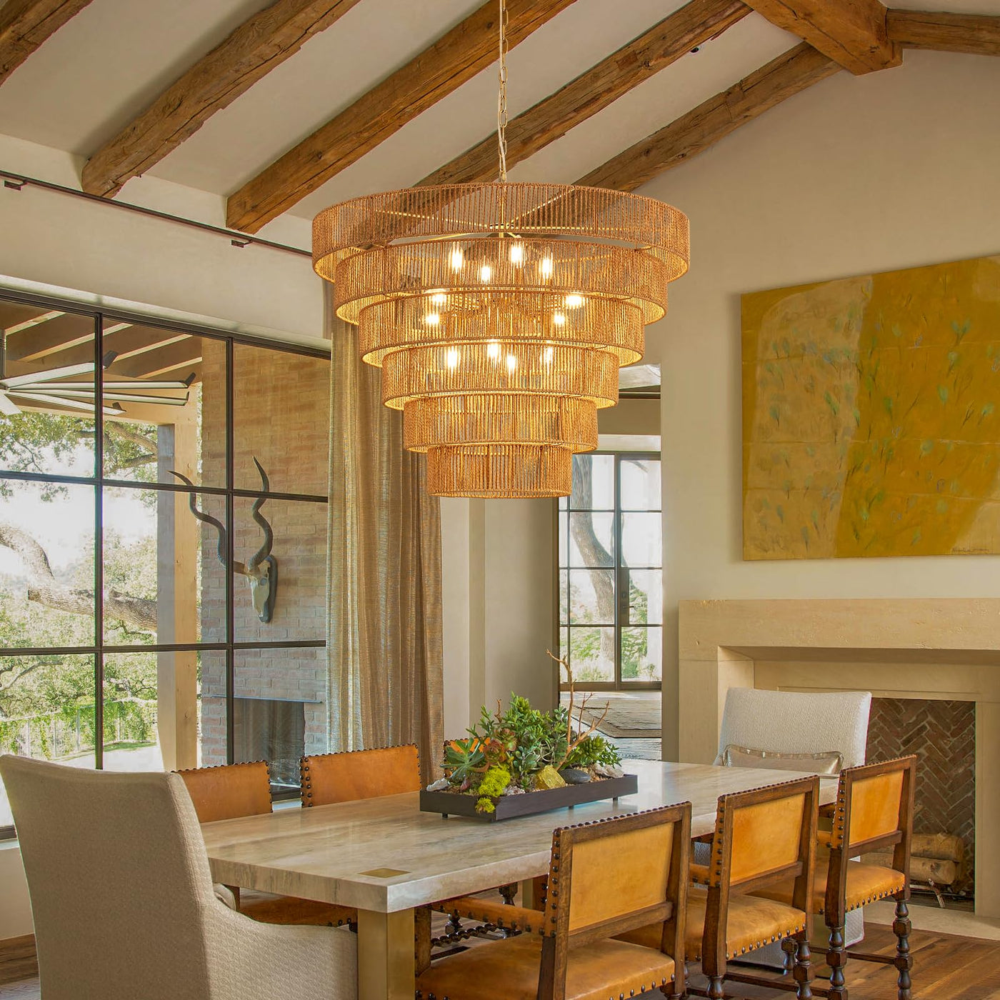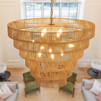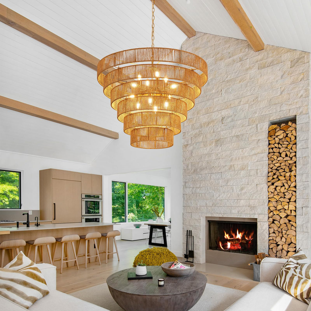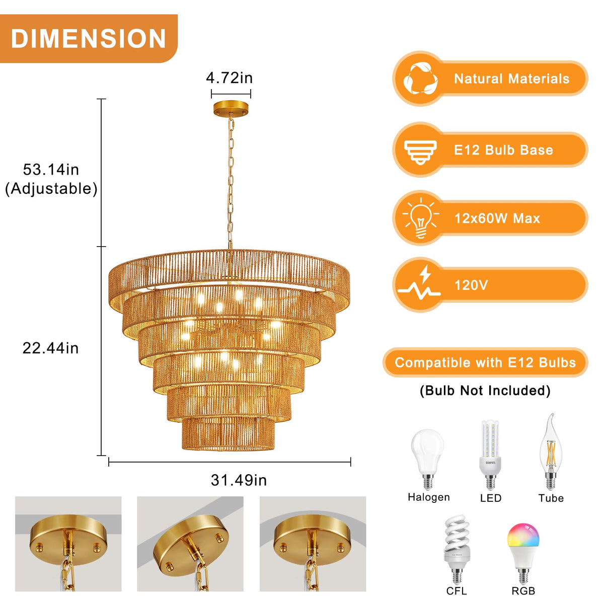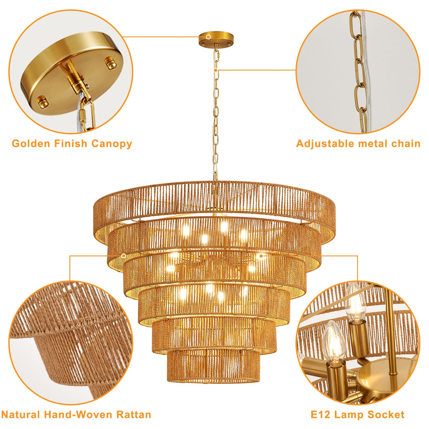 The rattan chandelier crafted with meticulous attention to detail, this exquisite lighting fixture marries the timeless beauty of wicker rattan with the contemporary allure of a gold finish. Create an inviting, warm ambiance in your home while making a statement with our vintage boho rattan chandelier. Our rattan chandelier is a true masterpiece, showcasing the artistry of rattan weaving. Expertly handcrafted, each piece features a seamless, delicate weave that captures the essence of nature, giving your home a rustic, yet sophisticated appeal. The bamboo chandelier dining room boasts durability and longevity. Its six round metal frames provide stability, ensuring that your chandelier maintains its shape and beauty for years to come.The chandelier's elegant, matte gold finish effortlessly complements any decor style. Whether your home is modern, classic, or eclectic, this chandelier will effortlessly blend in while adding a touch of Bohemian chic. The chandelier's semicircular hollow cage design creates a stunning visual effect when illuminated. As light passes through the simple rattan weave, it casts mesmerizing patterns across your room, adding depth and character to your space. The combination of rattan's rustic charm and the classic gold finish captures the retro and modern style, making it an ideal addition to your eclectic interior. This chandelier is not just a light fixture; it's a work of art that instantly elevates your decor. Whether you hang it above your dining table, in the living room, or a cozy nook, it's sure to become the focal point of your space. This rattan chandelier is suitable for various rooms. Install it in your bedroom for a touch of romance, in the kitchen for a rustic flair, or in the entryway for a warm welcome.The intricate rattan weave diffuses light beautifully, casting a soft and inviting glow that's perfect for relaxation and creating a warm atmosphere for gatherings. Our chandelier comes with all the necessary hardware for a straightforward installation process. We take pride in offering a high-quality product. The rattan chandelier light fixture has been designed to meet our stringent standards for craftsmanship and performance. We're confident it will meet and exceed your expectations.