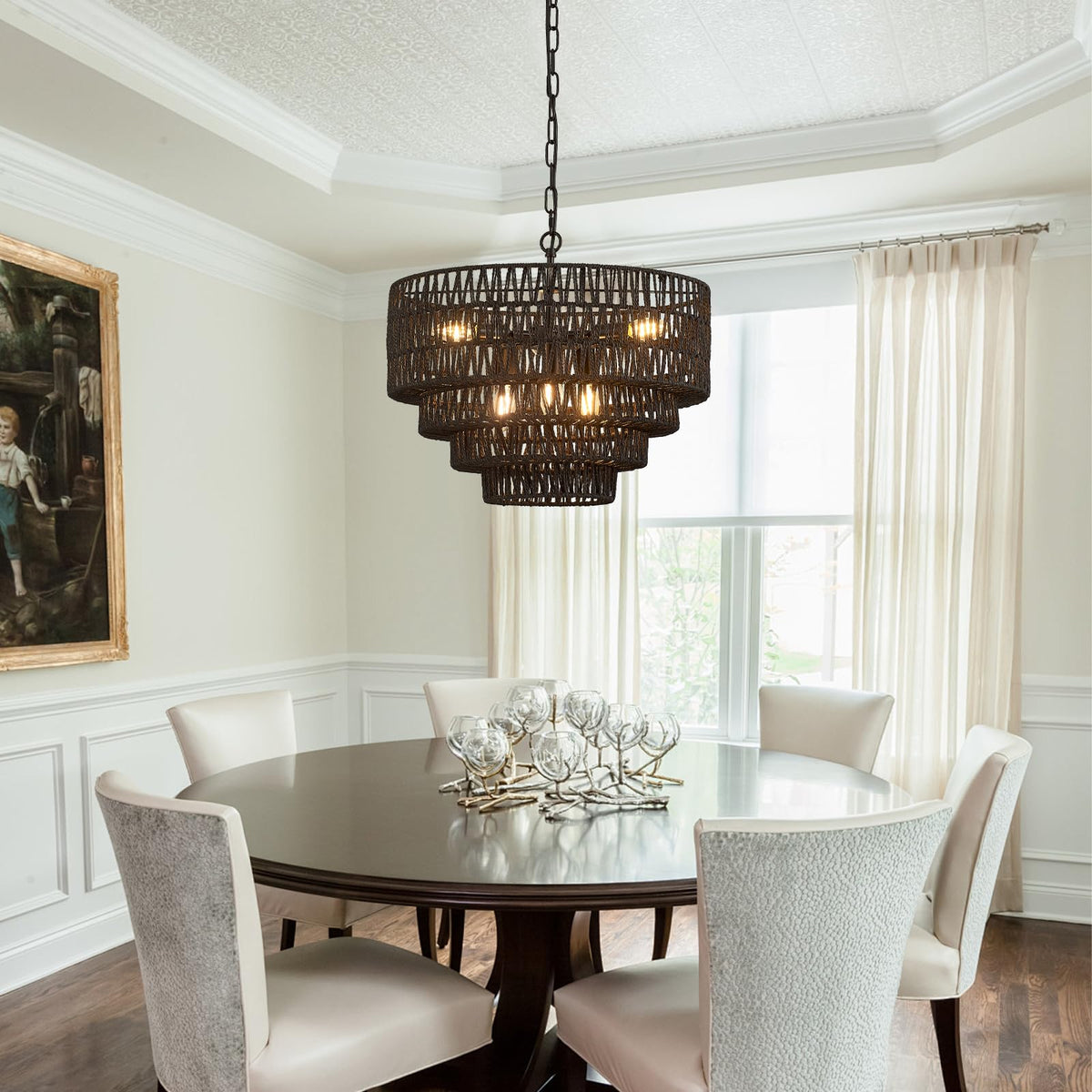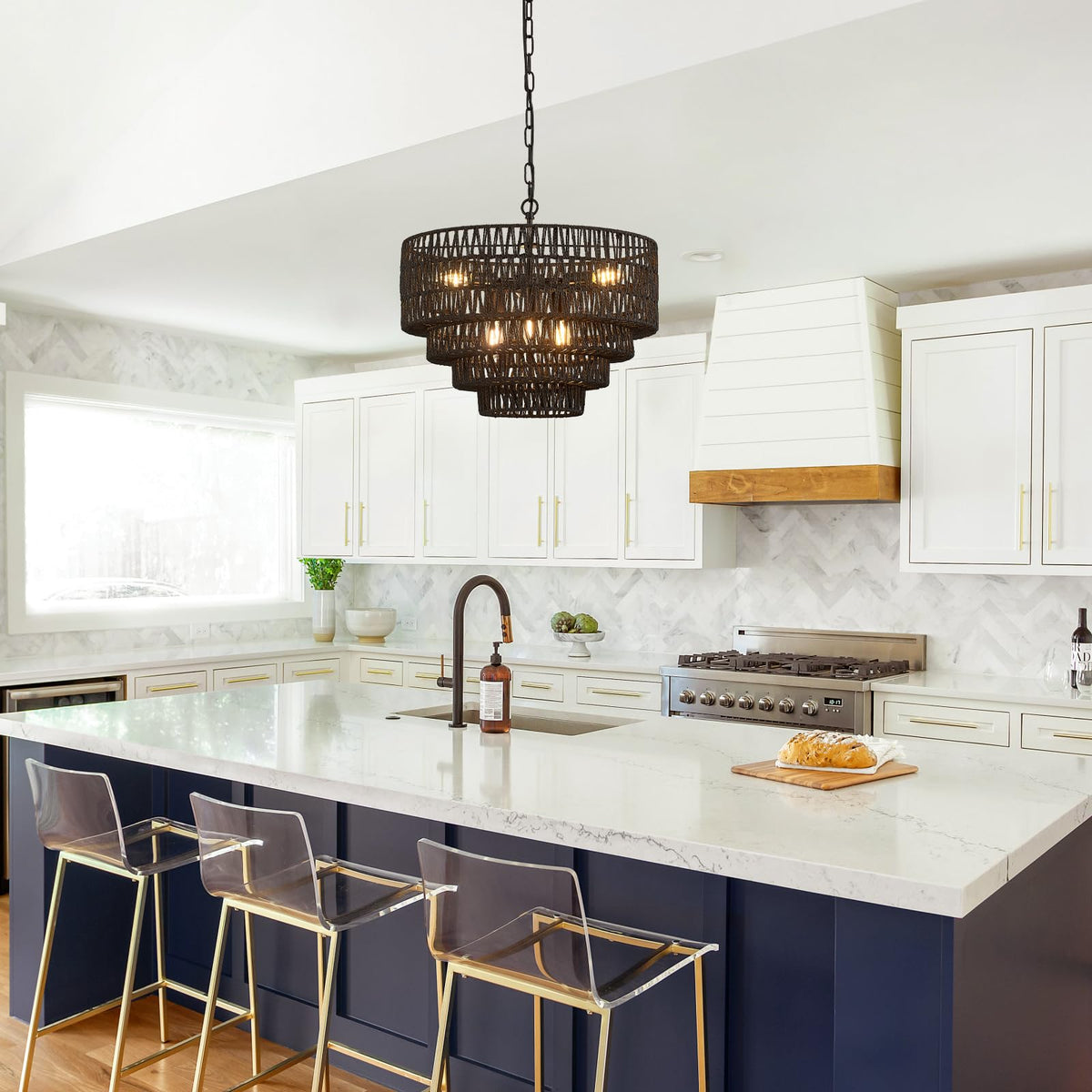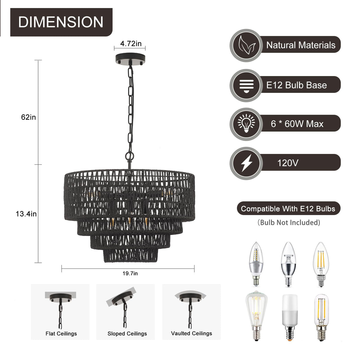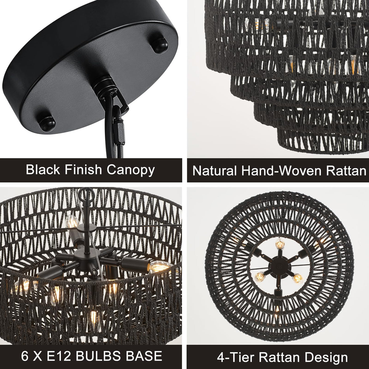 The rattan chandelier crafted with meticulous attention to detail, this exquisite lighting fixture marries the timeless beauty of wicker rattan with the contemporary allure of a gold finish. Create an inviting, warm ambiance in your home while making a statement with our vintage boho rattan chandelier. Our rattan chandelier is a true masterpiece, showcasing the artistry of rattan weaving. Expertly handcrafted, each piece features a seamless, delicate weave that captures the essence of nature, giving your home a rustic, yet sophisticated appeal. The bamboo chandelier dining room boasts durability and longevity. Its six round metal frames provide stability, ensuring that your chandelier maintains its shape and beauty for years to come.The chandelier's elegant, matte gold finish effortlessly complements any decor style. Whether your home is modern, classic, or eclectic, this chandelier will effortlessly blend in while adding a touch of Bohemian chic. The chandelier's semicircular hollow cage design creates a stunning visual effect when illuminated. As light passes through the simple rattan weave, it casts mesmerizing patterns across your room, adding depth and character to your space. The combination of rattan's rustic charm and the classic gold finish captures the retro and modern style, making it an ideal addition to your eclectic interior. This chandelier is not just a light fixture; it's a work of art that instantly elevates your decor. Whether you hang it above your dining table, in the living room, or a cozy nook, it's sure to become the focal point of your space. This rattan chandelier is suitable for various rooms. Install it in your bedroom for a touch of romance, in the kitchen for a rustic flair, or in the entryway for a warm welcome.The intricate rattan weave diffuses light beautifully, casting a soft and inviting glow that's perfect for relaxation and creating a warm atmosphere for gatherings. Our chandelier comes with all the necessary hardware for a straightforward installation process. We take pride in offering a high-quality product. The rattan chandelier light fixture has been designed to meet our stringent standards for craftsmanship and performance. We're confident it will meet and exceed your expectations.