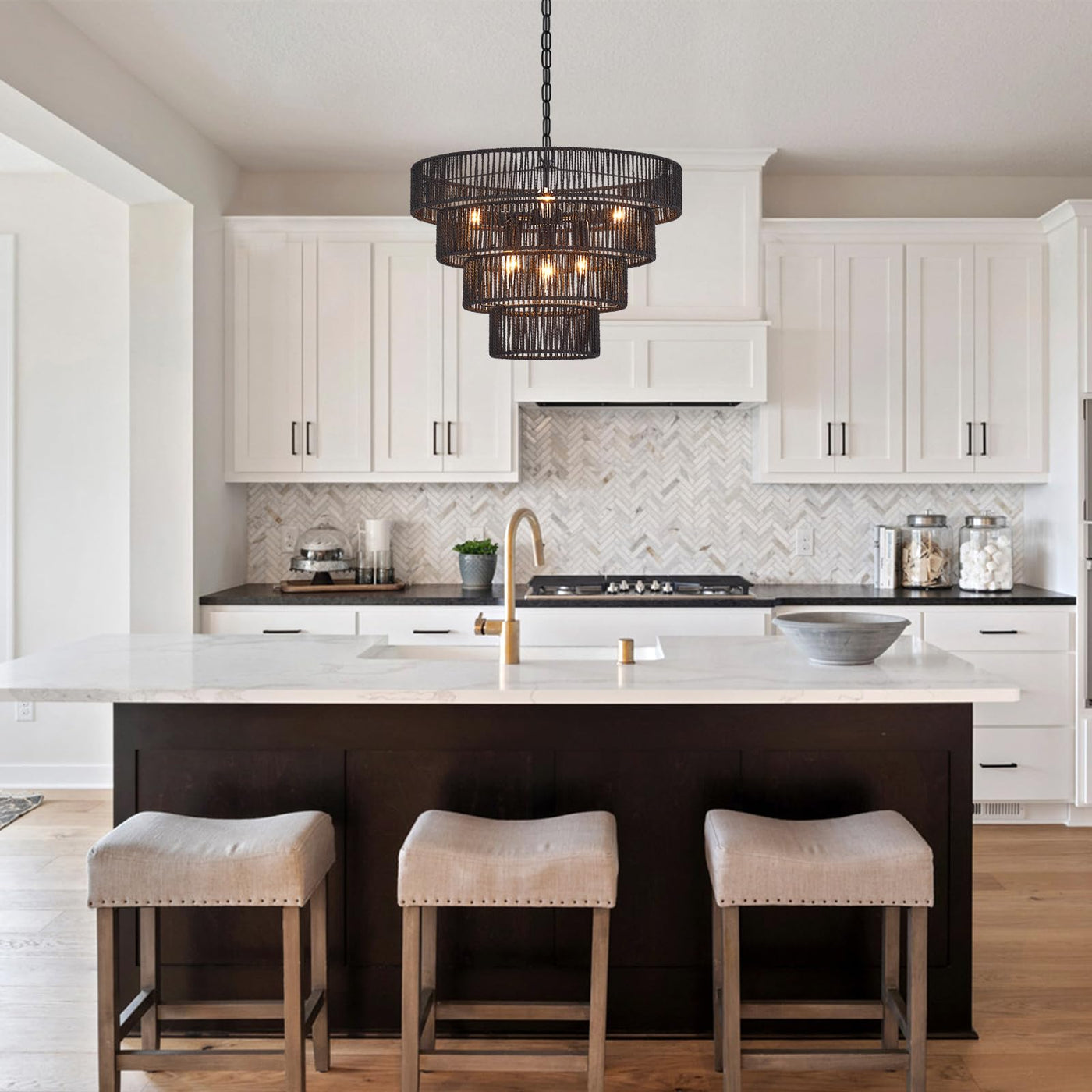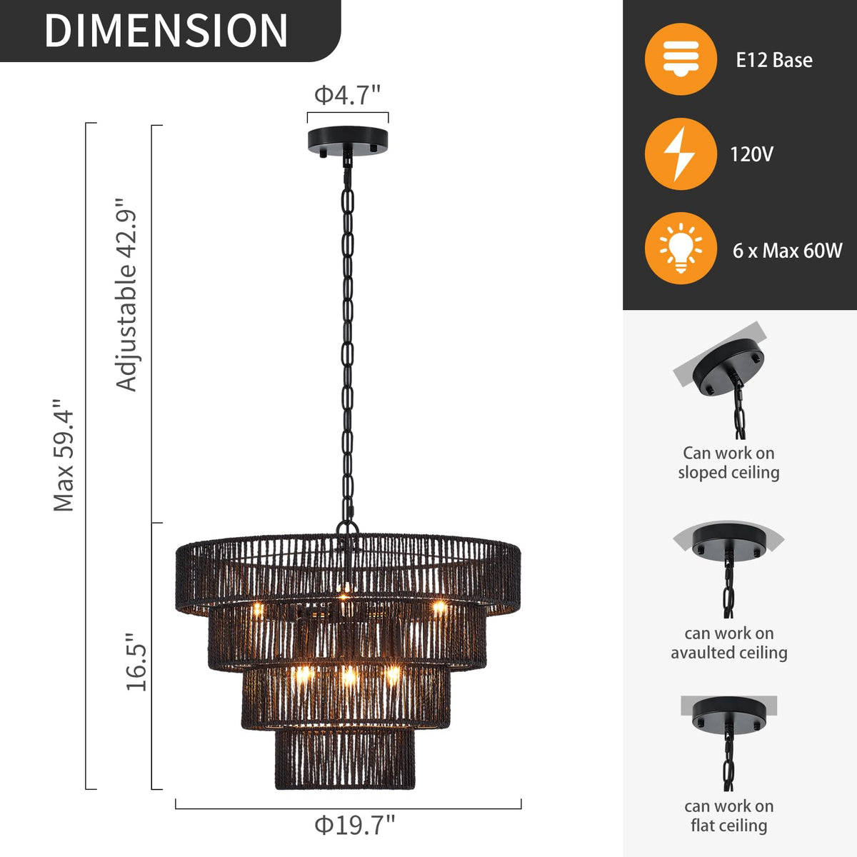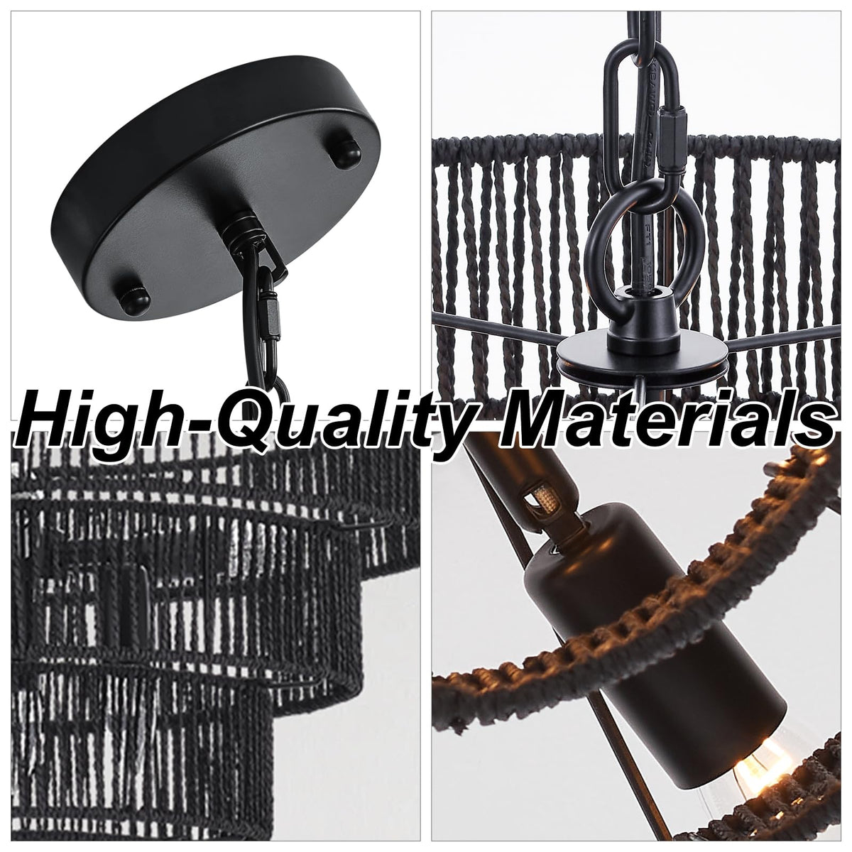 The black rattan chandelier crafted with meticulous attention to detail, this exquisite lighting fixture marries the timeless beauty of wicker rattan with the contemporary allure of a black finish. Create an inviting, warm ambiance in your home while making a statement with our vintage boho rattan chandelier. Our rattan chandelier is a true masterpiece, showcasing the artistry of rattan weaving. Expertly handcrafted, each piece features a seamless, delicate weave that captures the essence of nature, giving your home a rustic, yet sophisticated appeal. The bamboo black chandelier boasts durability and longevity. Its four round metal frames provide stability, ensuring that your chandelier maintains its shape and beauty for years to come.The chandelier's elegant, matte black finish effortlessly complements any decor style. Whether your home is modern, classic, or eclectic, this chandelier will effortlessly blend in while adding a touch of Bohemian chic. The chandelier's semicircular hollow cage design creates a stunning visual effect when illuminated. As light passes through the simple rattan weave, it casts mesmerizing patterns across your room, adding depth and character to your space. The combination of rattan's rustic charm and the classic black finish captures the retro and modern style, making it an ideal addition to your eclectic interior. This chandelier is not just a light fixture; it's a work of art that instantly elevates your decor. Whether you hang it above your dining table, in the living room, or a cozy nook, it's sure to become the focal point of your space. This rattan chandelier is suitable for various rooms. Install it in your bedroom for a touch of romance, in the kitchen for a rustic flair, or in the entryway for a warm welcome.The intricate rattan weave diffuses light beautifully, casting a soft and inviting glow that's perfect for relaxation and creating a warm atmosphere for gatherings. Our chandelier comes with all the necessary hardware for a straightforward installation process. We take pride in offering a high-quality product. The black chandelier light fixture has been designed to meet our stringent standards for craftsmanship and performance. We're confident it will meet and exceed your expectations.