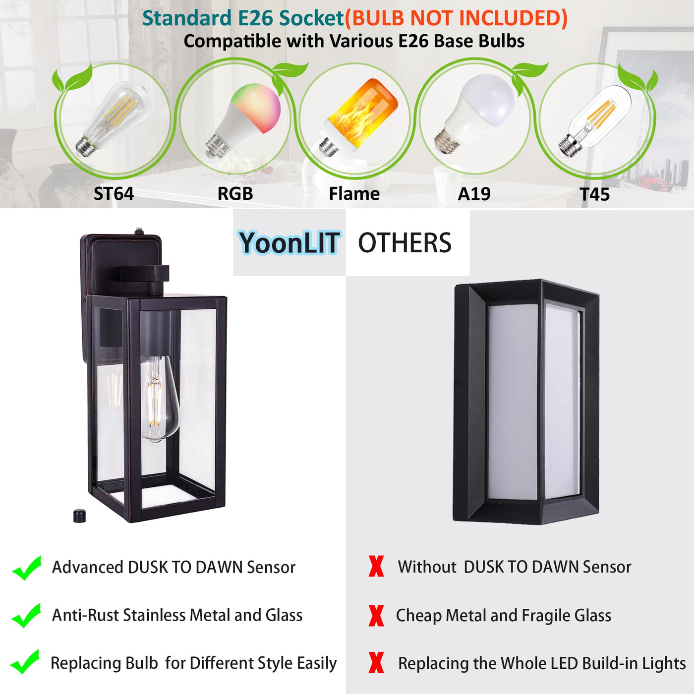 YoonLIT SMARTLIFE Dusk to Dawn Outdoor Wall Lantern, Wall Sconce as Porch Light Fixtures, Anti-Rust Galvanized Housing Plus Clear Glass, BULB NOT INCLUDED, Oil Rubbed Bronze, 2 Pack