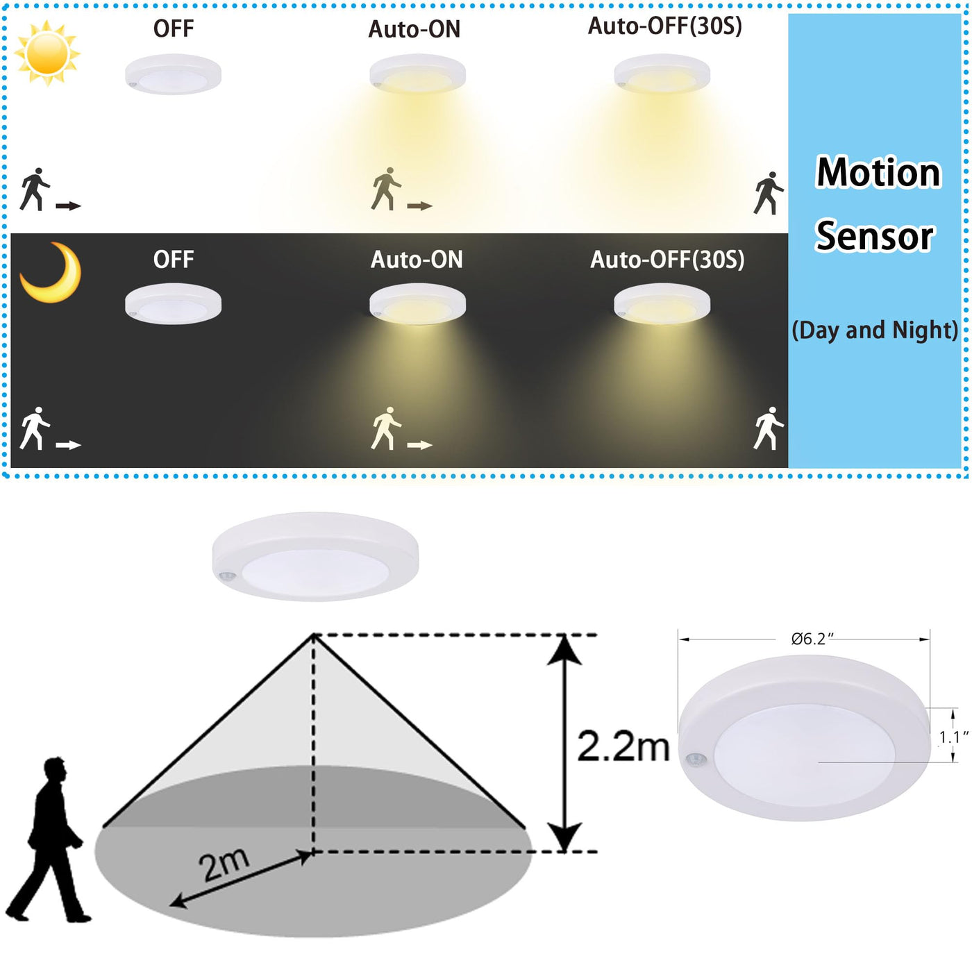This 6.2-inch flush mount light features a sleek, modern design with a 3000K white finish that seamlessly blends with any décor. Crafted from anti-rust galvanized housing, it is built to withstand moisture, making it suitable for damp locations. The advanced PIR motion sensor technology activates the light when human movement is detected within a 10-foot range, turning off automatically after 30 seconds of inactivity. This smart feature not only enhances safety but also conserves energy.
