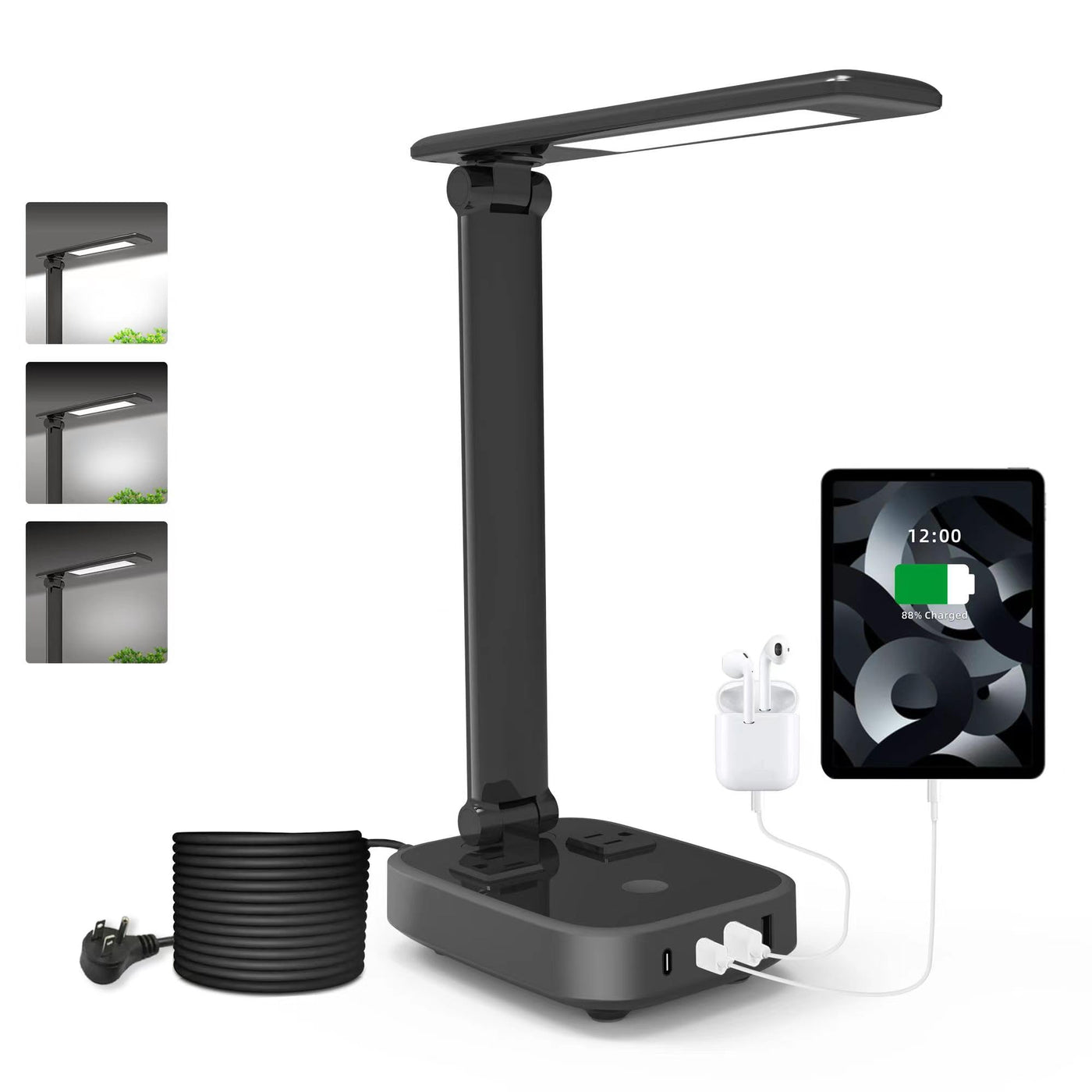 Q: What are the charging capabilities of the LED desk lamp?A: The LED Desk Lamp features 4 USB charging ports (2 USB A and 2 USB C) and 2 AC outlets, allowing you to charge multiple devices simultaneously, including phones, tablets, and other electronics, while also providing power to additional devices.