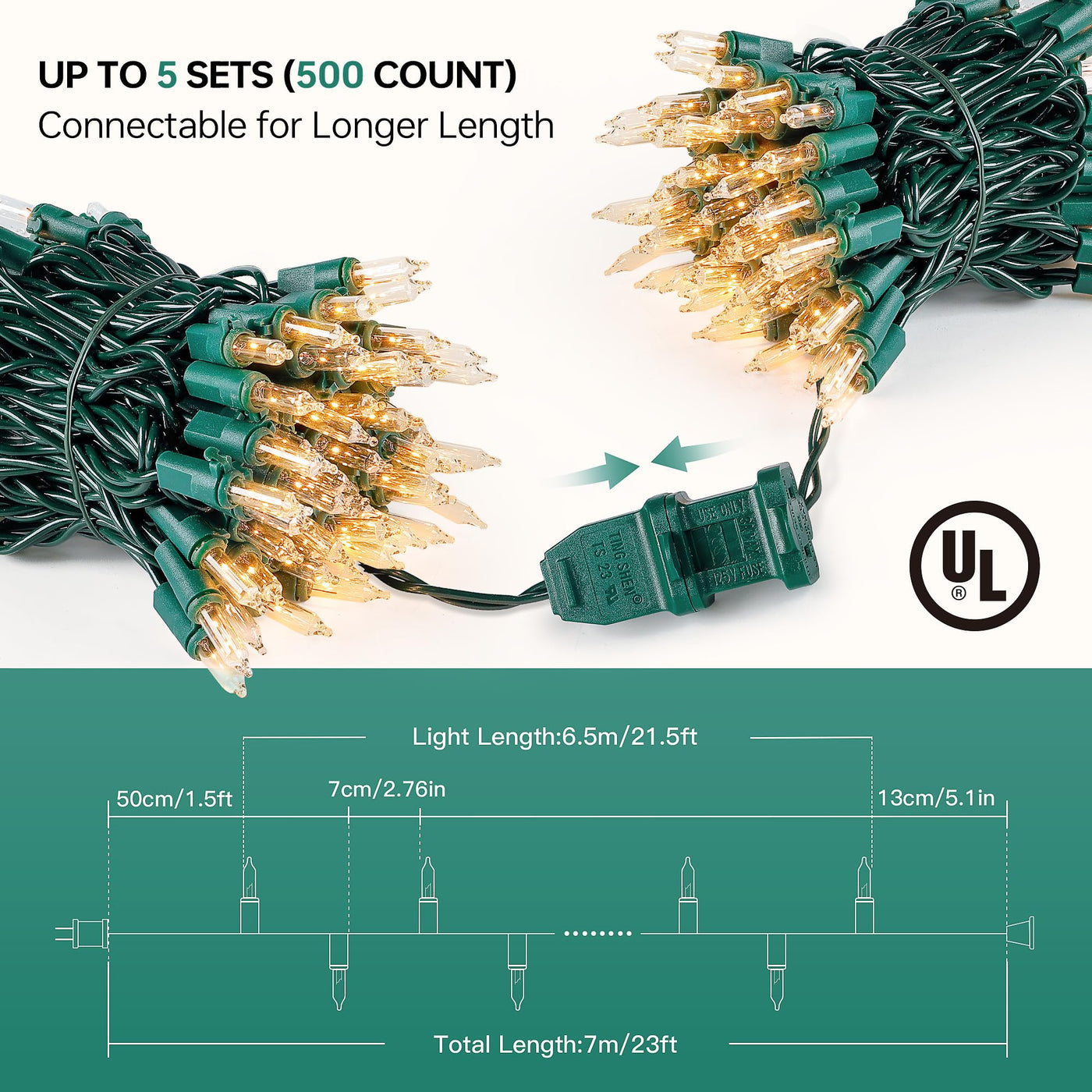 Youngar Christmas Lights, Clear Outdoor Lights,2 Pack 23Ft 100 Green Wire Lights Connectable Incandescent Mini Light,Ul Approved