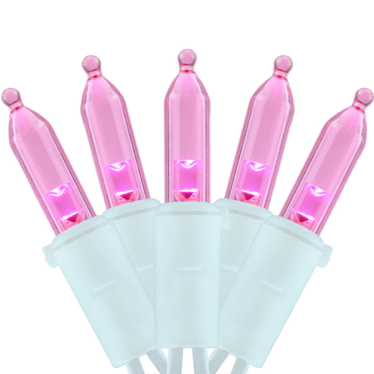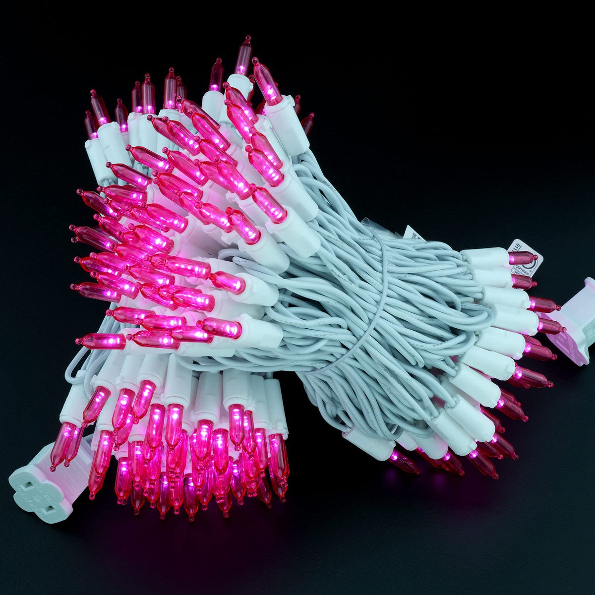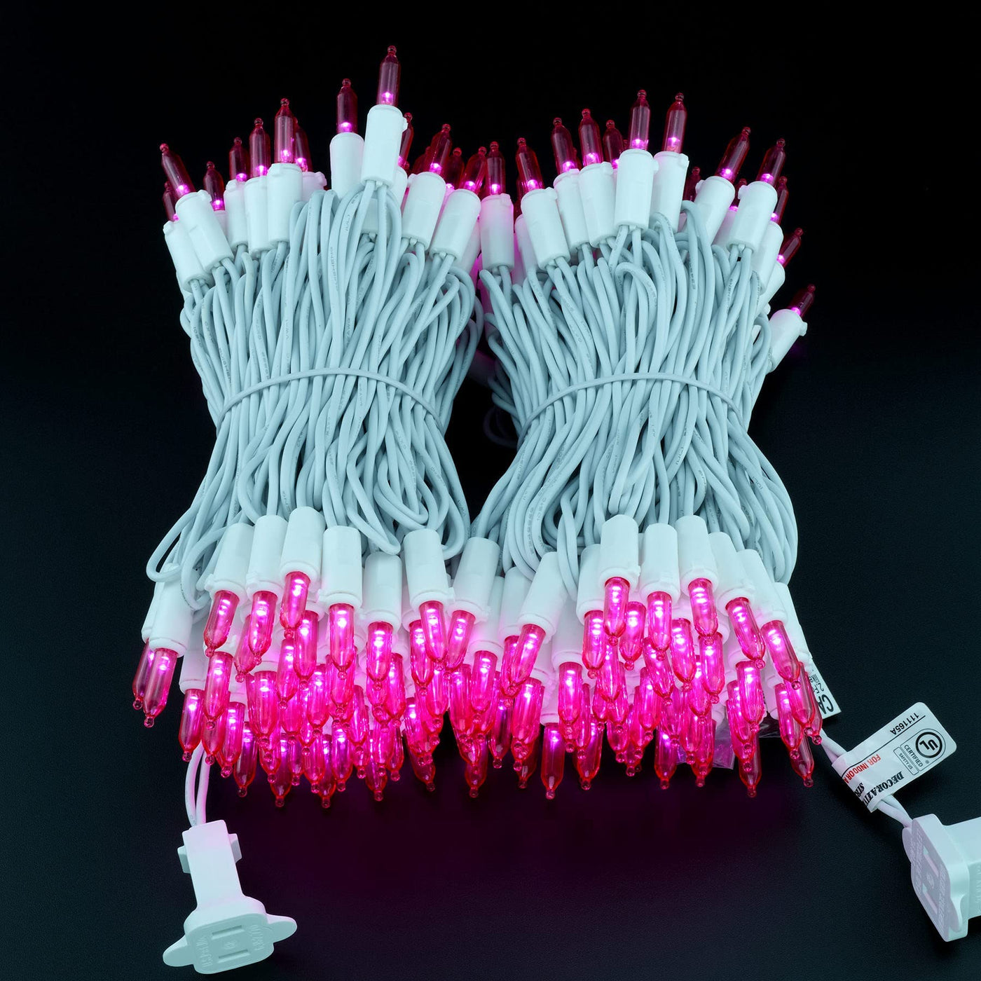 LED Light Color: Pink Light Display: Steady Bulb Type: LED Bulb Shape: Mini Bulb Material: Acrylic Removable Bulbs: Yes Average Hours: 50,000 Feature: One goes out the rest stay lit Voltage: 120 V Wire Color: White Wire Gauge: 22 AWG Male Plug: Fused/Stackable Female Plug: End-to-End Rating: UL Certified Grade: Premium Fire Resistance Rating: Class A 105? Ingress Protection Rating: IP44 Usage: Indoor / Outdoor Dimensions: - Total Length: 66 ft - Lead: 4 in - Spacing: 4 in - Tail: 4 in Actual Power: - 7 Watts - 30 Max sets connected