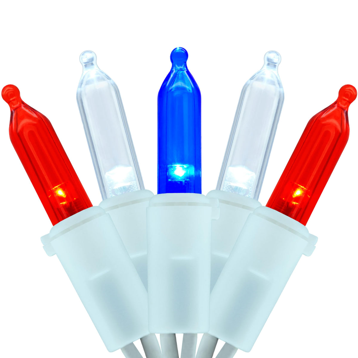 LED Light Color: Red White & Blue Light Display: Steady Bulb Type: LED Bulb Shape: Mini Bulb Material: Acrylic Removable Bulbs: Yes Average Hours: 50,000 Feature: One goes out the rest stay lit Voltage: 120 V Wire Color: White Wire Gauge: 22 AWG Male Plug: Fused/Stackable Female Plug: End-to-End Rating: UL Certified Grade: Premium Fire Resistance Rating: Class A 105? Ingress Protection Rating: IP44 Usage: Indoor / Outdoor Dimensions: - Total Length: 66 ft - Lead: 4 in - Spacing: 4 in - Tail: 4 in Actual Power: - 7 Watts - 30 Max sets connected