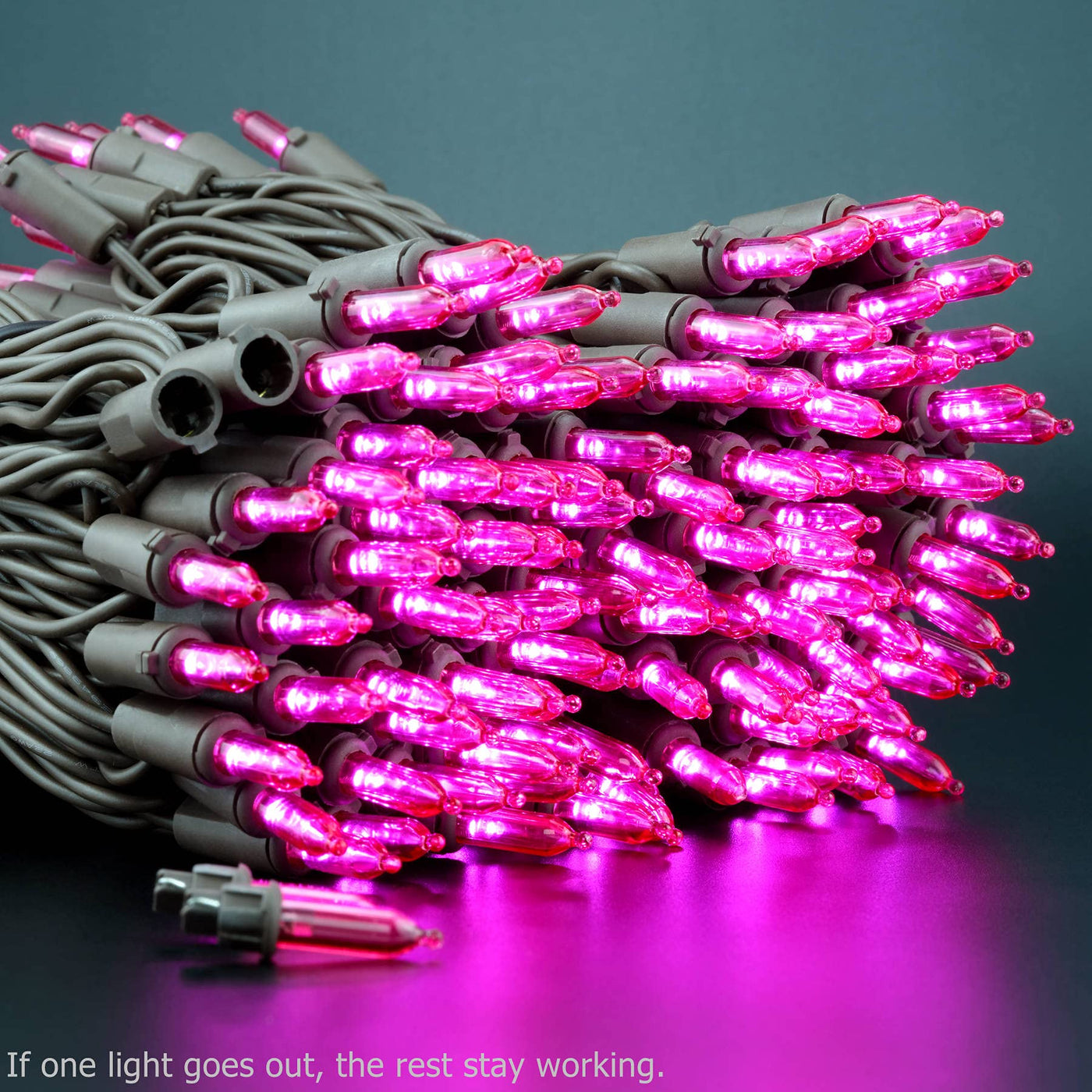 200 Pink Led Christmas Lights With Brown Wire, 66 Feet Brown Wire Ul Certified Commercial Grade Led Holiday String Light Set (Pink - Brown Wire) ? Specifications Led Light Color: Pink Light Display: Steady Bulb Type: Led Bulb Shape: Mini Bulb Material: Acrylic Removable Bulbs: Yes Average Hours: 50,000 Feature: One Goes Out The Rest Stay Lit Voltage: 120 V Wire Color: Brown Wire Gauge: 22 Awg Male Plug: Fused/Stackable Female Plug: End-To-End Rating: Ul Certified Grade: Premium Fire Resistance Rating: Class A 105? Ingress Protection Rating: Ip44 Usage: Indoor / Outdoor Dimensions: - Total Length: 66 Ft - Lead: 6 In - Spacing: 4 In - Tail: 6 In Actual Power: - 7 Watts - 30 Max Sets Connected ? What'S In The Box: 1 X 200 Led Pink String Lights 2 X Extra Fuse 4 X Extra Led Bulbs 1 X User Manual ? Warm Tips. 1. One Package Contains 1 Strand Of Uninterrupted 200 Lights, Not Multiple Strands. 2. Male And Female Plugs Must Not Be Wet Or Immersed In Water. 3. End-To-End Connections With More Than 30 Strands Running Simultaneously, Or Input Voltage Above 120 Volts Will Blow The Fuse. 4. Fuse Is Located In Male Plug And 2 Replacement Fuses Included In Each Strand. 5. Additional Fuses May Be Purchased Locally At Auto Parts And Hardware Stores.