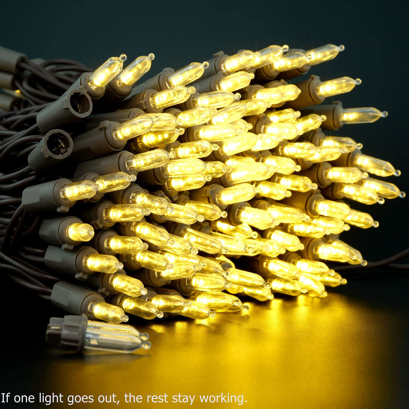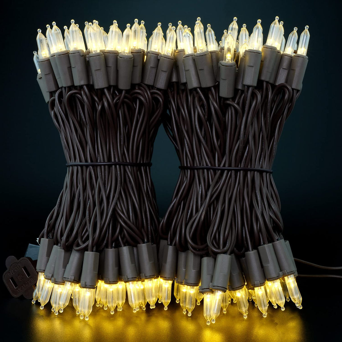 Warm White Led Christmas Lights With Brown Wire, 66 Feet 200 Count Ul Certified Commercial Grade Led Holiday String Light Set (Warm White - Brown Wire) ? Specifications Led Light Color: Warm White Light Display: Steady Bulb Type: Led Bulb Shape: Mini Bulb Material: Acrylic Removable Bulbs: Yes Average Hours: 50,000 Feature: One Goes Out The Rest Stay Lit Voltage: 120 V Wire Color: Brown Wire Gauge: 22 Awg Male Plug: Fused/Stackable Female Plug: End-To-End Rating: Ul Certified Grade: Premium Fire Resistance Rating: Class A 105? Ingress Protection Rating: Ip44 Usage: Indoor / Outdoor Dimensions: - Total Length: 66 Ft - Lead: 4 In - Spacing: 4 In - Tail: 4 In Actual Power: - 7 Watts - 30 Max Sets Connected ? What'S In The Box: 1 X 200 Led Warm White String Lights 2 X Extra Fuse 4 X Extra Led Bulbs 1 X User Manual ? Warm Tips. 1. One Package Contains 1 Strand Of Uninterrupted 200 Lights, Not Multiple Strands. 2. Male And Female Plugs Must Not Be Wet Or Immersed In Water. 3. End-To-End Connections With More Than 30 Strands Running Simultaneously, Or Input Voltage Above 120 Volts Will Blow The Fuse. 4. Fuse Is Located In Male Plug And 2 Replacement Fuses Included In Each Strand. 5. Additional Fuses May Be Purchased Locally At Auto Parts And Hardware Stores.