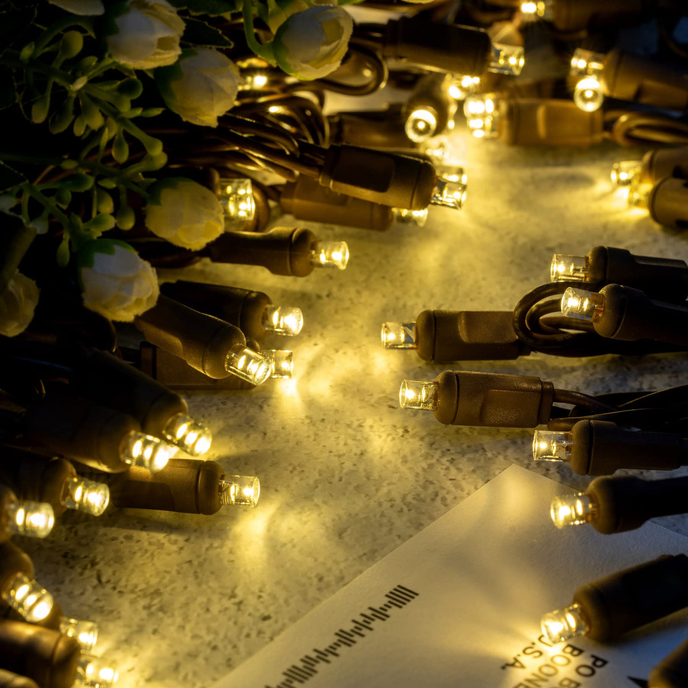 140 count warm white 5MM wide-angle LED bulbs on a durable brown wire.