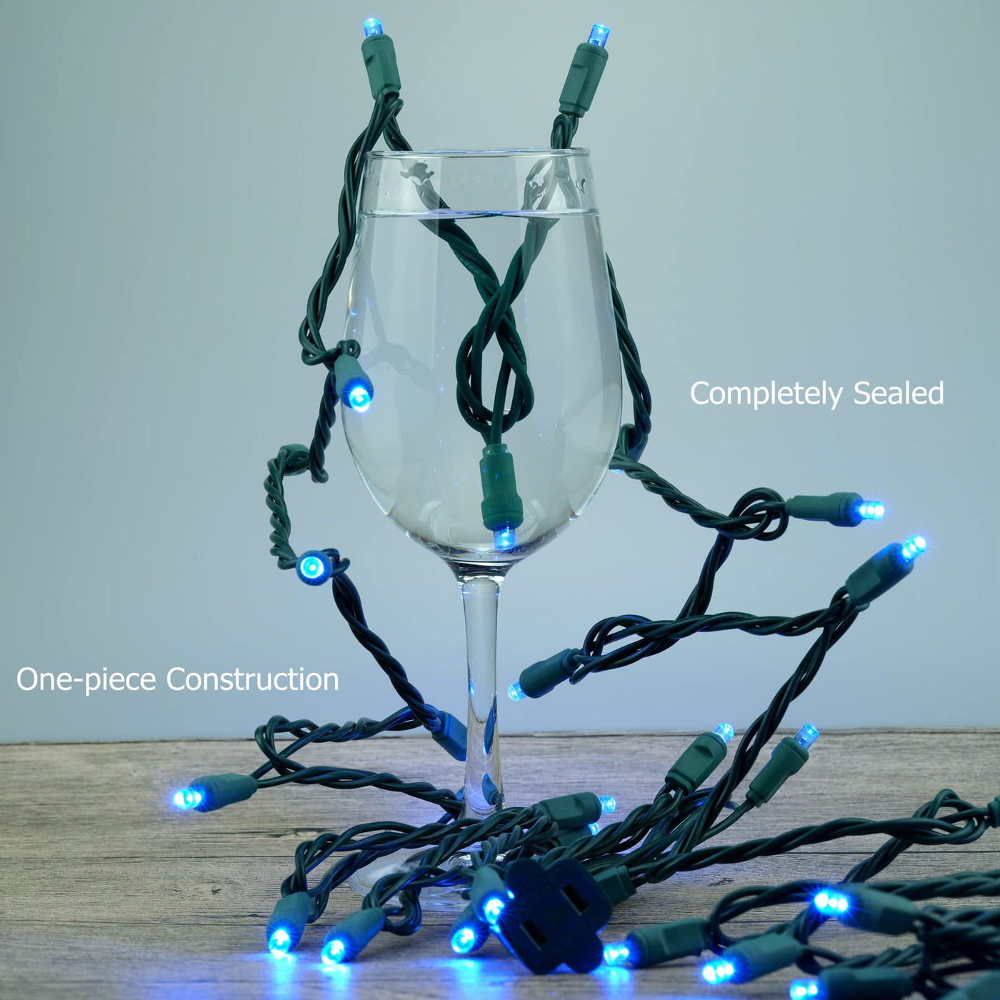 Yuletime Blue 5Mm Led Christmas Lights, 33 Ft 100 Count 4'' Spacing One-Piece High Waterproof Wide Angle Ul Certified String Light (Blue - Green Wire) Specifications Led Light Color: Blue Light Display: Steady Bulb Type: Led Bulb Shape: 5Mm Wide Angle Bulb Material: Acrylic Removable Bulbs: No Average Hours: 100,000 Voltage: 120 V Wire Color: Green Wire Gauge: 22 Awg Male Plug: Fused/Stackable Female Plug: End-To-End Rating: Ul Certified Grade: Premium Fire Resistance Rating: Class A 105? Ingress Protection Rating: Ip67 Usage: Indoor / Outdoor Dimensions: - Total Length: 33 Ft - Lead: 4 In - Spacing: 4 In - Tail: 4 In Actual Power: - 7.2 Watts - 216 Watts End-To-End Maximum - 30 Max Sets Connected What'S In The Box: 1 X 100 Led 5Mm String Lights 2 X Extra Fuse 1 X User Manual