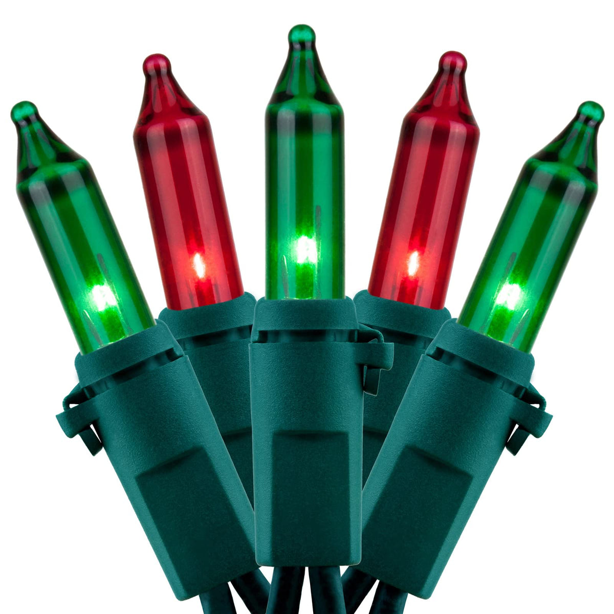 Q: What type of bulbs are used in these string lights?A: The string lights use incandescent bulbs that provide a warm glow, and each strand contains one hundred red and green mini bulbs.