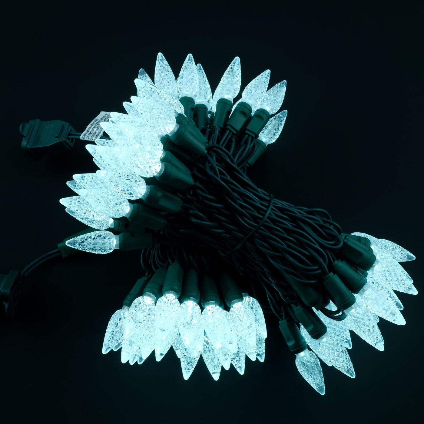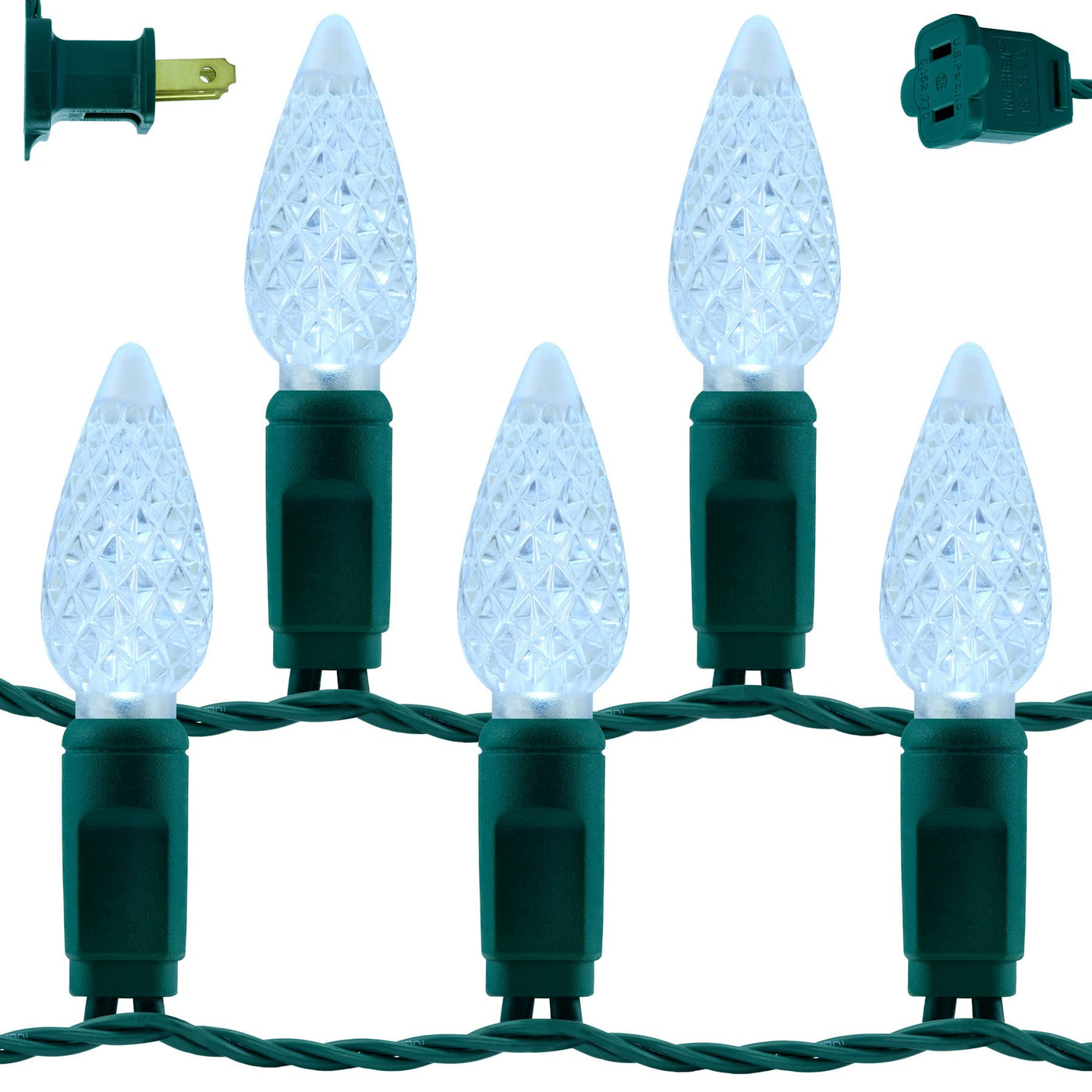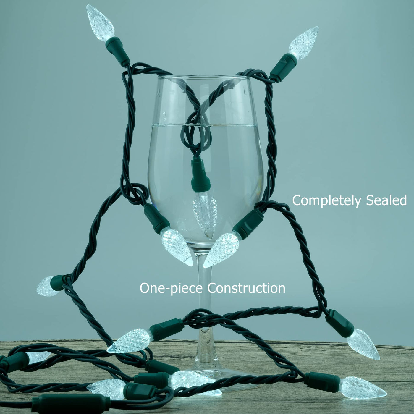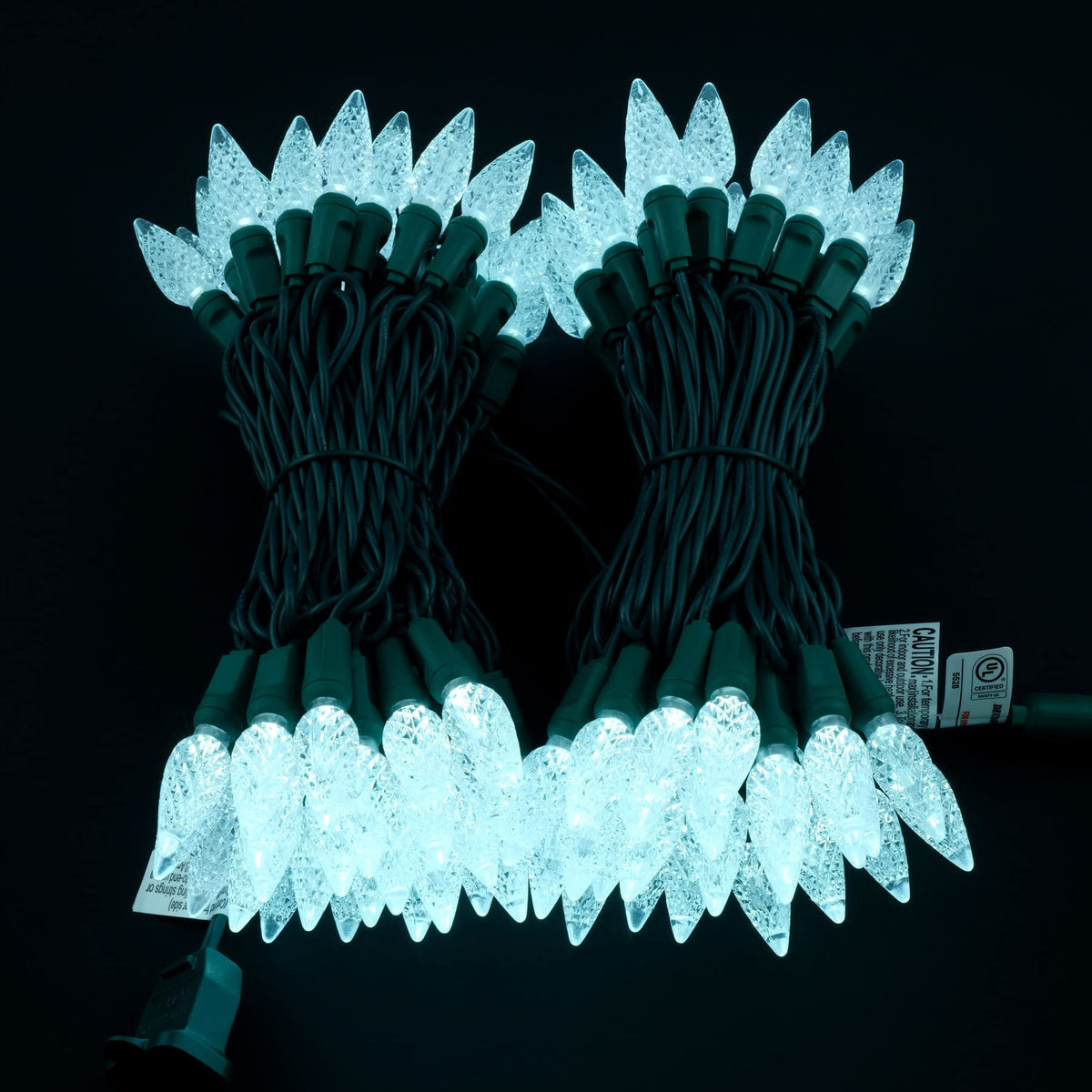 Cool White C6 Strawberry Led Christmas Lights, 33 Ft 100 Count 4'' Spacing One-Piece High Waterproof Ul Certified String Light (Cool White) ? Specifications Led Light Color: Cool White Light Display: Steady Bulb Type: Led Bulb Shape: C6 Strawberry Bulb Material: Acrylic Removable Bulbs: No Average Hours: 50,000 Feature: One-Piece High Waterproof Voltage: 120 V Wire Color: Green Wire Gauge: 22 Awg Male Plug: Fused/Stackable Female Plug: End-To-End Rating: Ul Certified Grade: Premium Fire Resistance Rating: Class A 105? Ingress Protection Rating: Ip67 Usage: Indoor / Outdoor Dimensions: - Total Length: 33 Ft - Lead: 4 In - Spacing: 4 In - Tail: 4 In Actual Power: - 7.2 Watts - 216 Watts End-To-End Maximum - 30 Strands Connected ? What'S In The Box: 1 X 100 Led Cool White C6 String Lights 2 X Extra Fuse 1 X User Manual ? Warm Tips. 1. One Package Contains 1 Strand Of Uninterrupted 100 Lights, Not Multiple Strands. 2. Male And Female Plugs Must Not Be Wet Or Immersed In Water. 3. End-To-End Connections With More Than 30 Strands Running Simultaneously Will Blow The Fuse. 4. Fuse Is Located In Male Plug And 2 Replacement Fuses Included In Each Strand. 5. Additional Fuses May Be Purchased Locally At Auto Parts And Hardware Stores.