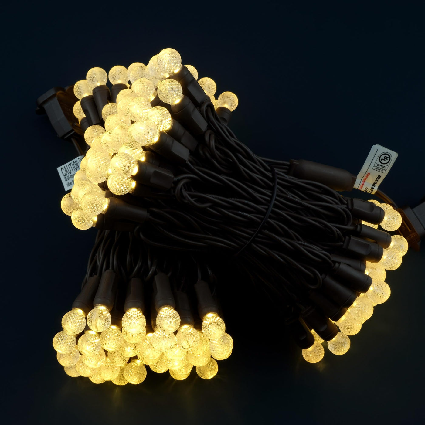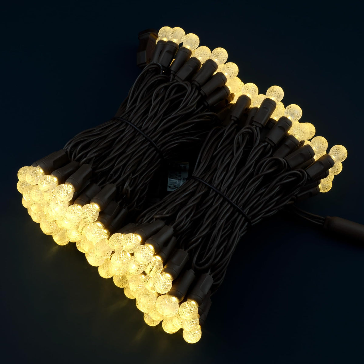 These LED string lights feature a total length of 48 feet, consisting of two strands of 70 warm white G12 raspberry bulbs on a brown wire. The bulbs are not removable and are crafted from durable acrylic material, ensuring longevity and resistance against the elements. With an average lifespan of up to 50,000 hours, these lights are energy-efficient and perfect for long-term use. The fully sealed construction makes them highly waterproof, allowing for safe outdoor use even in humid and rainy conditions.
