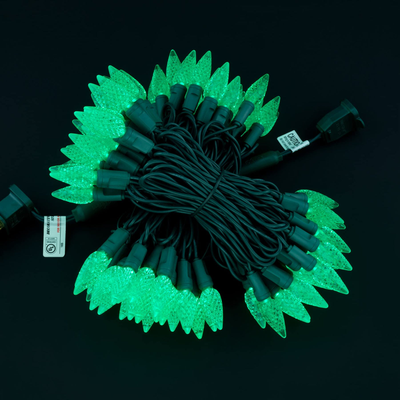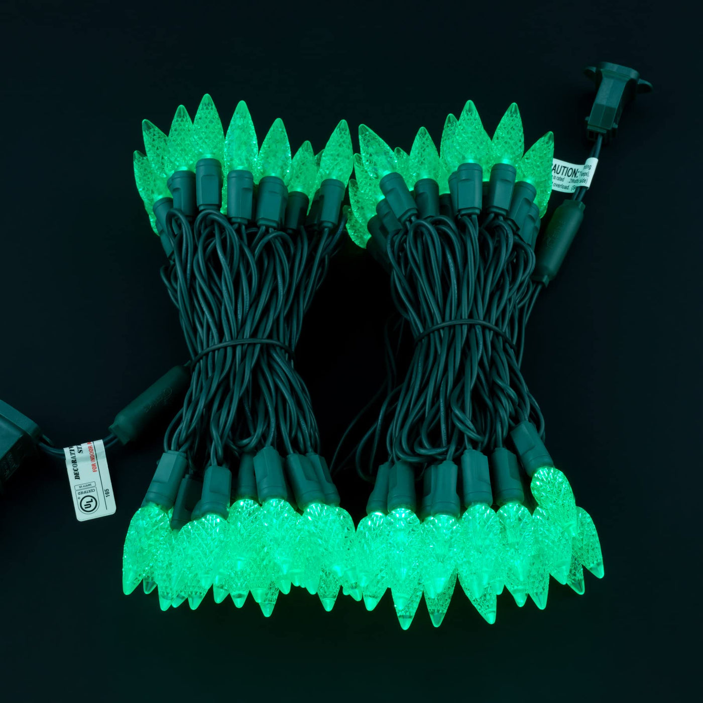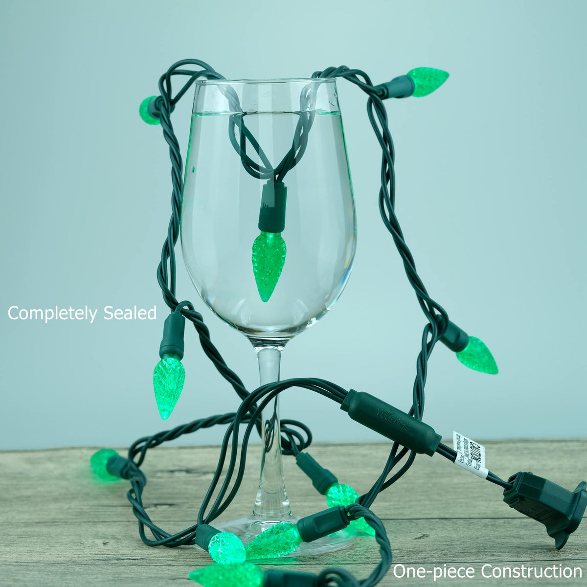 Green C6 Strawberry Led Christmas Lights, 33 Ft 100 Count 4'' Spacing One-Piece High Waterproof Ul Certified String Light (Green) ? Specifications Led Light Color: Green Light Display: Steady Bulb Type: Led Bulb Shape: C6 Strawberry Bulb Material: Acrylic Removable Bulbs: No Average Hours: 50,000 Feature: One-Piece High Waterproof Voltage: 120 V Wire Color: Green Wire Gauge: 22 Awg Male Plug: Fused/Stackable Female Plug: End-To-End Rating: Ul Certified Grade: Premium Fire Resistance Rating: Class A 105? Ingress Protection Rating: Ip67 Usage: Indoor / Outdoor Dimensions: - Total Length: 33 Ft - Lead: 4 In - Spacing: 4 In - Tail: 4 In Actual Power: - 7.2 Watts - 216 Watts End-To-End Maximum - 30 Strands Connected ? What'S In The Box: 1 X 100 Led Green C6 String Lights 2 X Extra Fuse 1 X User Manual ? Warm Tips. 1. One Package Contains 1 Strand Of Uninterrupted 100 Lights, Not Multiple Strands. 2. Male And Female Plugs Must Not Be Wet Or Immersed In Water. 3. End-To-End Connections With More Than 30 Strands Running Simultaneously Will Blow The Fuse. 4. Fuse Is Located In Male Plug And 2 Replacement Fuses Included In Each Strand. 5. Additional Fuses May Be Purchased Locally At Auto Parts And Hardware Stores.