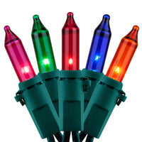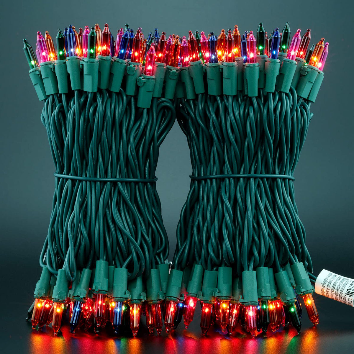 Multicolor Christmas Lights with Green Wire, 66 Feet 200 Count UL Certified String Lights, Pack of 2 Sets 33 Ft 100 Count Incandescent Mini Light Set (Multicolor - Green Wire) ? SPECIFICATIONS Light Color: Multicolor (Red, Orange, Green, Blue, Pink) Light Display: Steady Bulb Type: Incandescent Bulb Shape: Classic Bulb Material: Glass Removable Bulbs: Yes Average Hours: 3,000 Voltage: 120 V Wire Color: Green Wire Gauge: 22 AWG Male Plug: Fused/Stackable Female Plug: End-to-end Rating: UL Certified Grade: Premium Fire Resistance Rating: Class A 105? Ingress Protection Rating: IP44 Usage: Indoor / Outdoor Warranty: 3000 Hours Dimensions: - Total Length: 33 ft x 2 - Lead: 6 in - Spacing: 4 in - Tail: 4 in Power: - 40.8 Watts / Strand - 216 Watts End-to-end Maximum - 5 Strands Maximum Connection ? WHAT'S IN THE BOX: 2 x 100 Multicolor Incandescent String Lights 8 x Replacement Bulbs 2 x Replacement Fuses 1 x User Manual ? Warm Tips. 1. Two strands of 100 lights in one package. 2. Incandescent bulbs warm up under operation. 3. The glass shell of the bulb can be broken. 4. Male and female plugs must not be wet or immersed in water. 5. End-to-end connections with more than 5 strands running simultaneously, or input voltage above 120 volts will blow the fuse. 6. Fuse is located in male plug and 2 replacement fuses included in each strand. 7. Additional fuses may be purchased locally at auto parts and hardware stores.