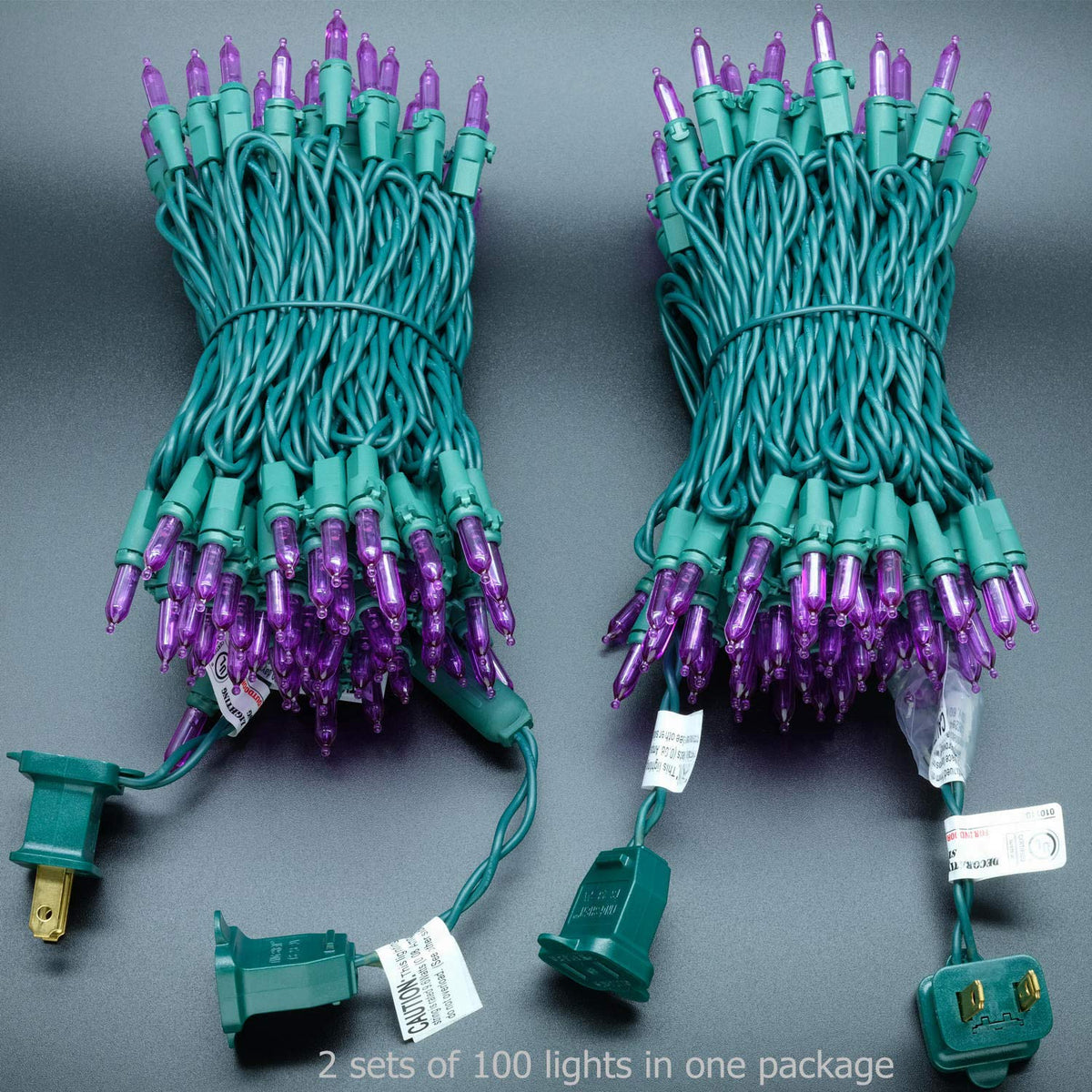 Yuletime Purple Led Christmas Lights 200 Count 50 Ft, Pack Of 2 Strands 25 Ft 100 Lights Ul Certified Commercial Grade String Light Set (Purple) Specifications Led Light Color: Purple Light Display: Steady Bulb Type: Led Bulb Shape: Mini Bulb Material: Acrylic Removable Bulbs: Yes Average Hours: 50,000 Voltage: 120 V Wire Color: Green Wire Gauge: 22 Awg Male Plug: Fused/Stackable Female Plug: End-To-End Rating: Ul Certified Grade: Premium Fire Resistance Rating: Class A 105? Ingress Protection Rating: Ip44 Usage: Indoor / Outdoor Dimensions: - Total Length: 25.5 Ft X 2 - Lead: 4 In - Spacing: 3 In - Tail: 4 In Actual Power: - 4.8 Watts / Strand - 216 Watts End-To-End Maximum - 45 Strands Maximum Connection What'S In The Box: 2 X 100 Led Purple String Lights 4 X Extra Fuse 4 X Extra Led Bulbs 1 X User Manual ? Warm Tips. 1. Two Strands Of 100 Lights In One Package. 2. Male And Female Plugs Must Not Be Wet Or Immersed In Water. 3. End-To-End Connections With More Than 45 Strands Running Simultaneously Will Blow The Fuse. 4. Fuse Is Located In Male Plug And 2 Replacement Fuses Included In Each Strand. 5. Additional Fuses May Be Purchased Locally At Auto Parts And Hardware Stores.