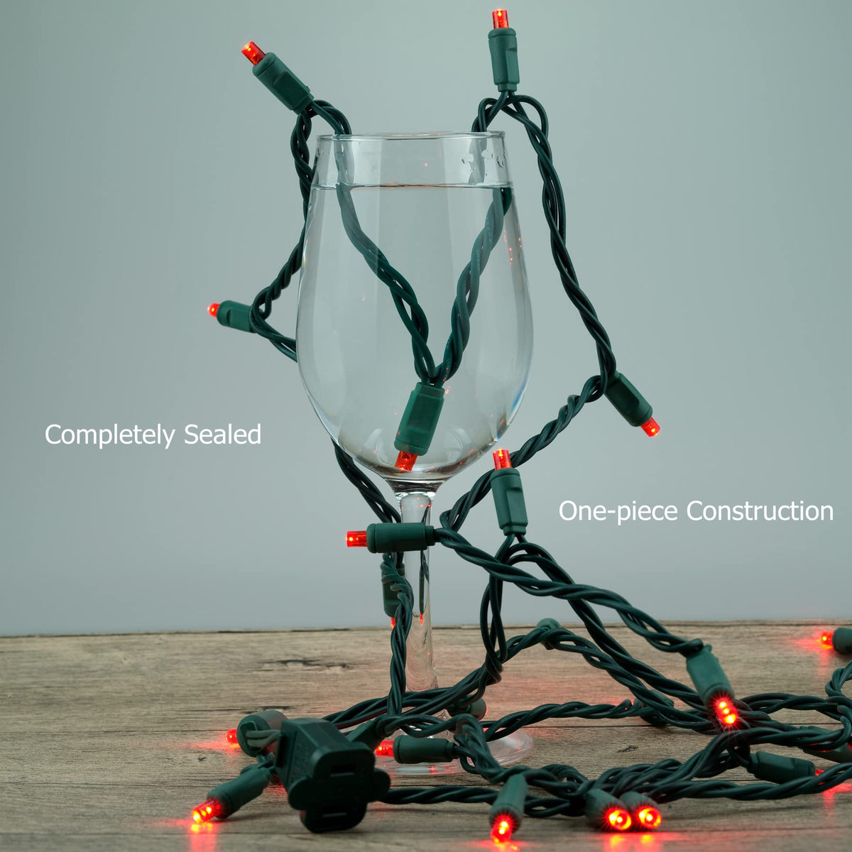 Yuletime Red 5Mm Led Christmas Lights, 33 Ft 100 Count 4'' Spacing One-Piece High Waterproof Wide Angle Ul Certified String Light (Red - Green Wire) Specifications Led Light Color: Red Light Display: Steady Bulb Type: Led Bulb Shape: 5Mm Wide Angle Bulb Material: Acrylic Removable Bulbs: No Average Hours: 100,000 Voltage: 120 V Wire Color: Green Wire Gauge: 22 Awg Male Plug: Fused/Stackable Female Plug: End-To-End Rating: Ul Certified Grade: Premium Fire Resistance Rating: Class A 105? Ingress Protection Rating: Ip67 Usage: Indoor / Outdoor Dimensions: - Total Length: 33 Ft - Lead: 4 In - Spacing: 4 In - Tail: 4 In Actual Power: - 7.2 Watts - 216 Watts End-To-End Maximum - 30 Max Sets Connected What'S In The Box: 1 X 100 Led 5Mm String Lights 2 X Extra Fuse 1 X User Manual
