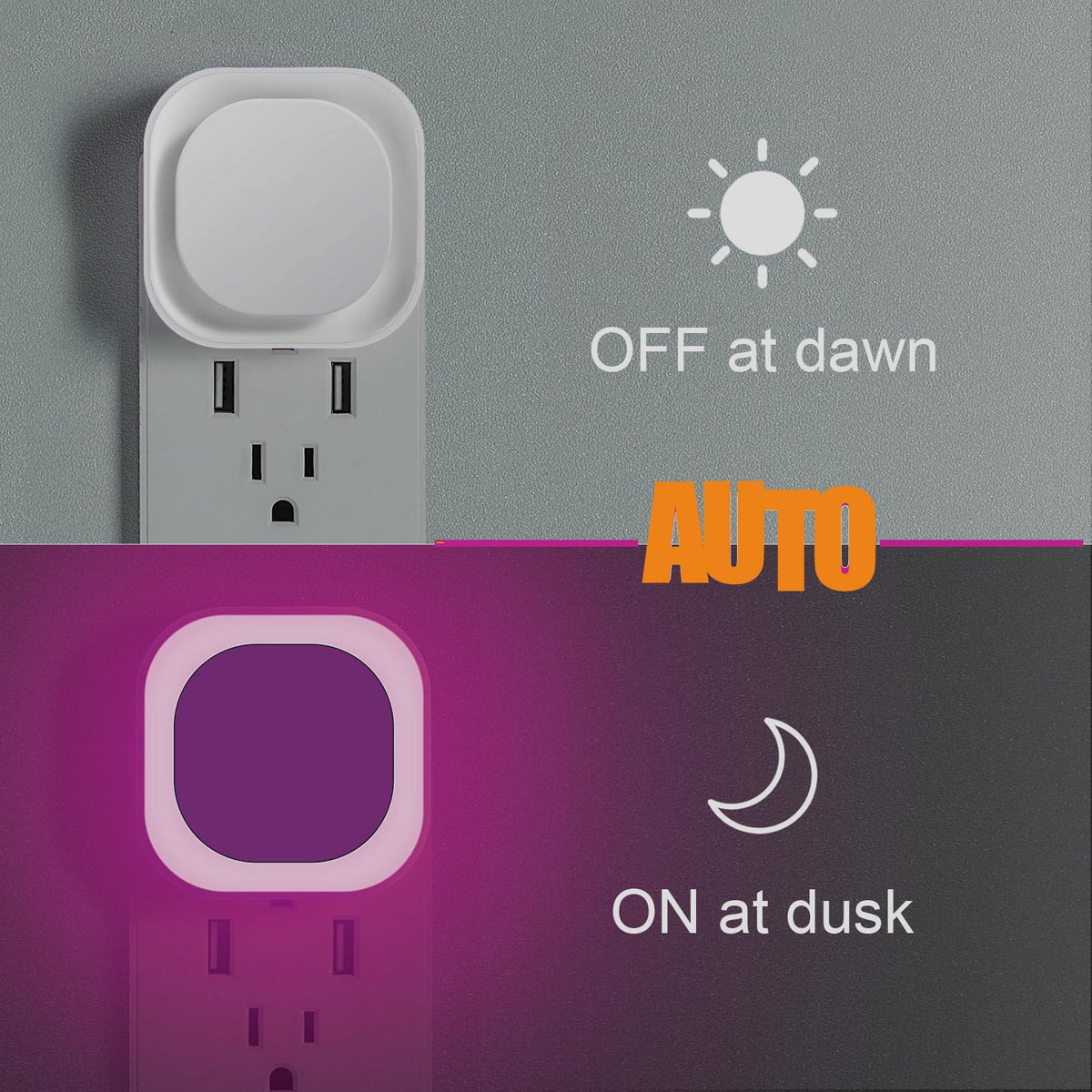 Q: How does the dusk to dawn sensor work?A: The built-in light sensor automatically detects the ambient light in your room, turning the YUNLEX night light ON at dusk or in dark conditions, and OFF at dawn or when the room is well-lit, providing hassle-free operation.