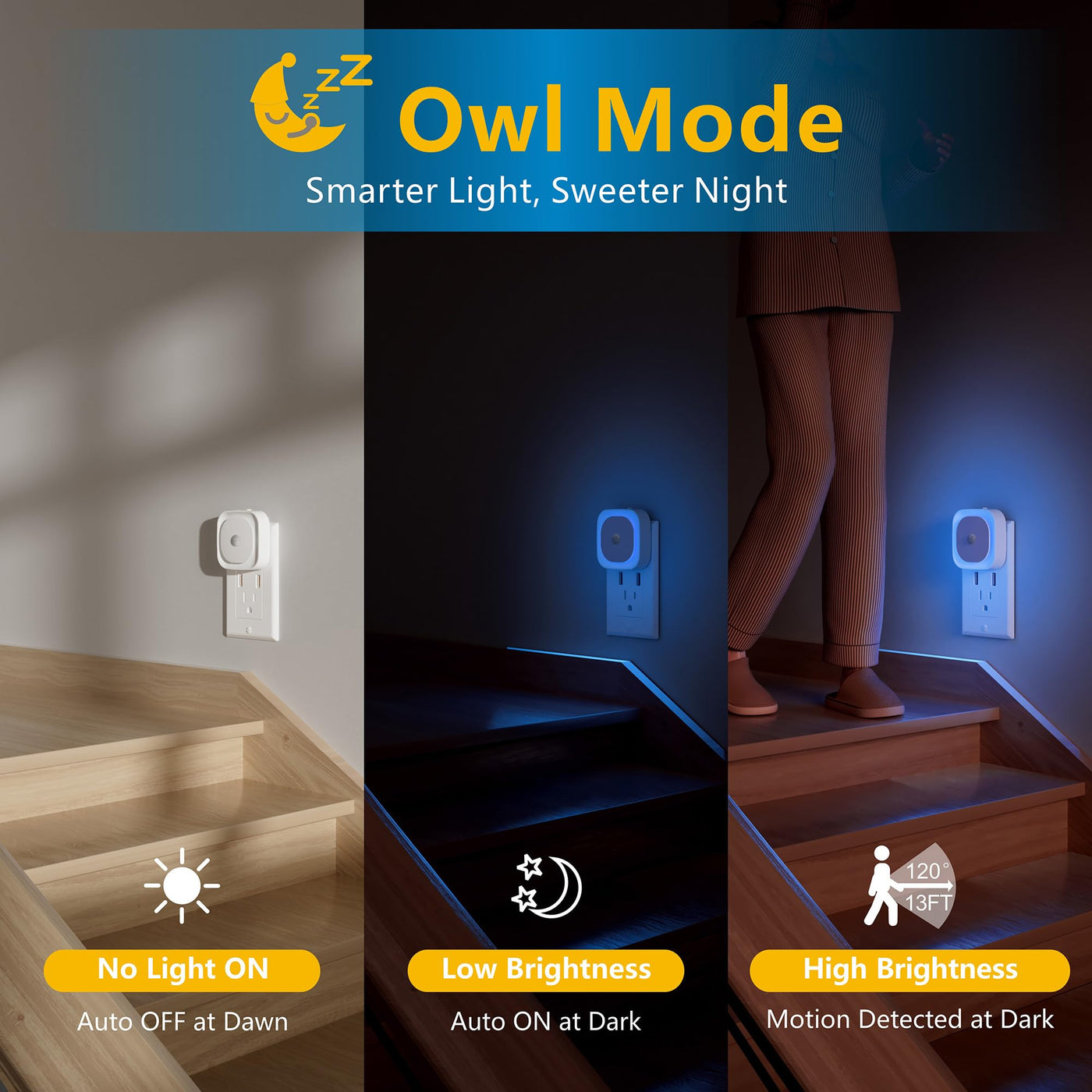 Q: What are the different sensor modes available in the YUNLEX night light?A: The YUNLEX night light features three sensor modes: Owl Mode, Light Sensor Mode, and Motion Sensor Mode. Owl Mode increases brightness when movement is detected and dims after 60 seconds of inactivity. Light Sensor Mode automatically turns the light on at dusk and off at dawn, while Motion Sensor Mode activates the light in the dark and turns it off after 60 seconds of no motion.