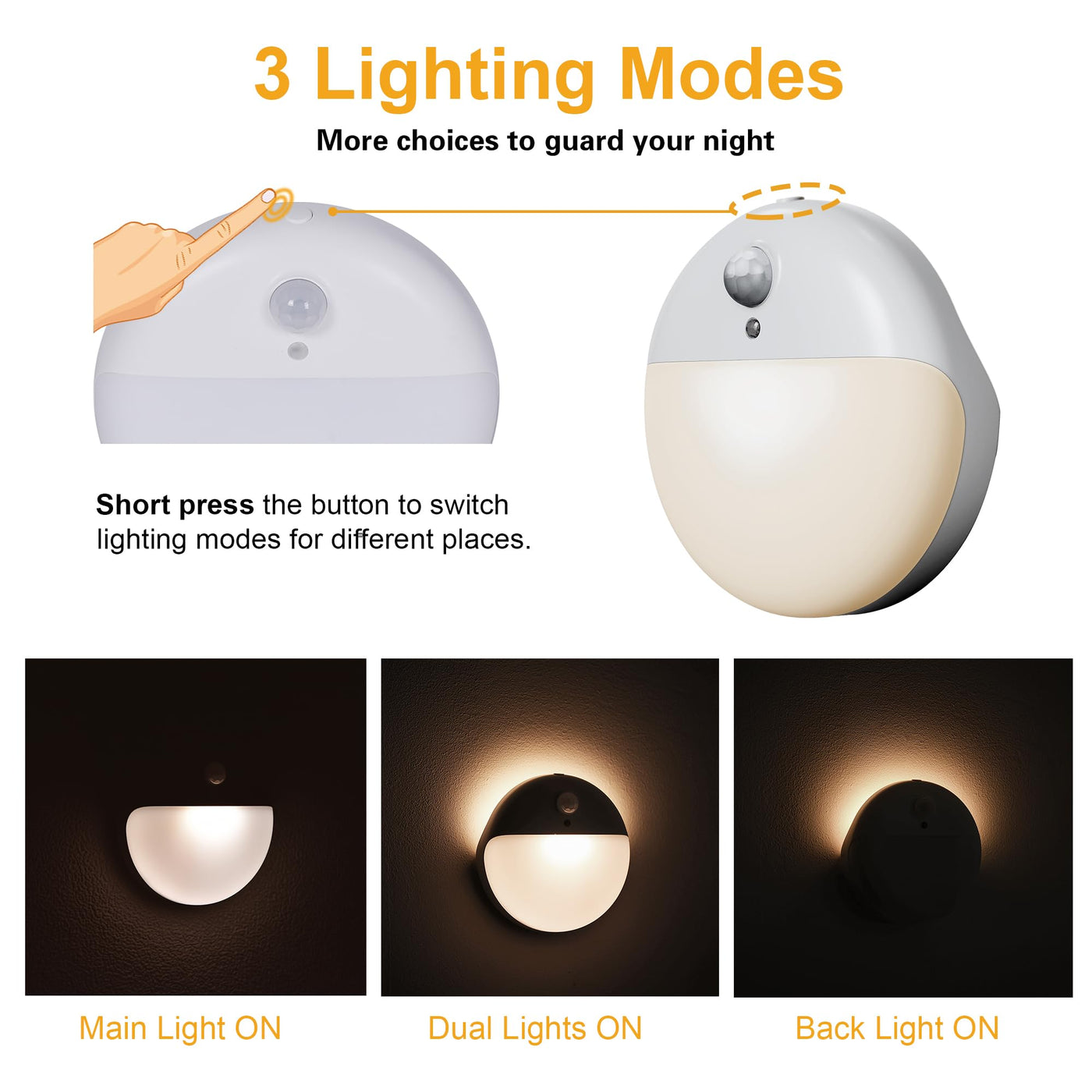Q: What are the different lighting modes available for the YUNLEX motion sensor night light?A: The YUNLEX motion sensor night light offers three lighting modes: main light on, backlight on, and dual lights on. This versatility allows you to choose the best option for your needs, whether you prefer a dim glow for sensitive lighting or a bright light for long hallways.