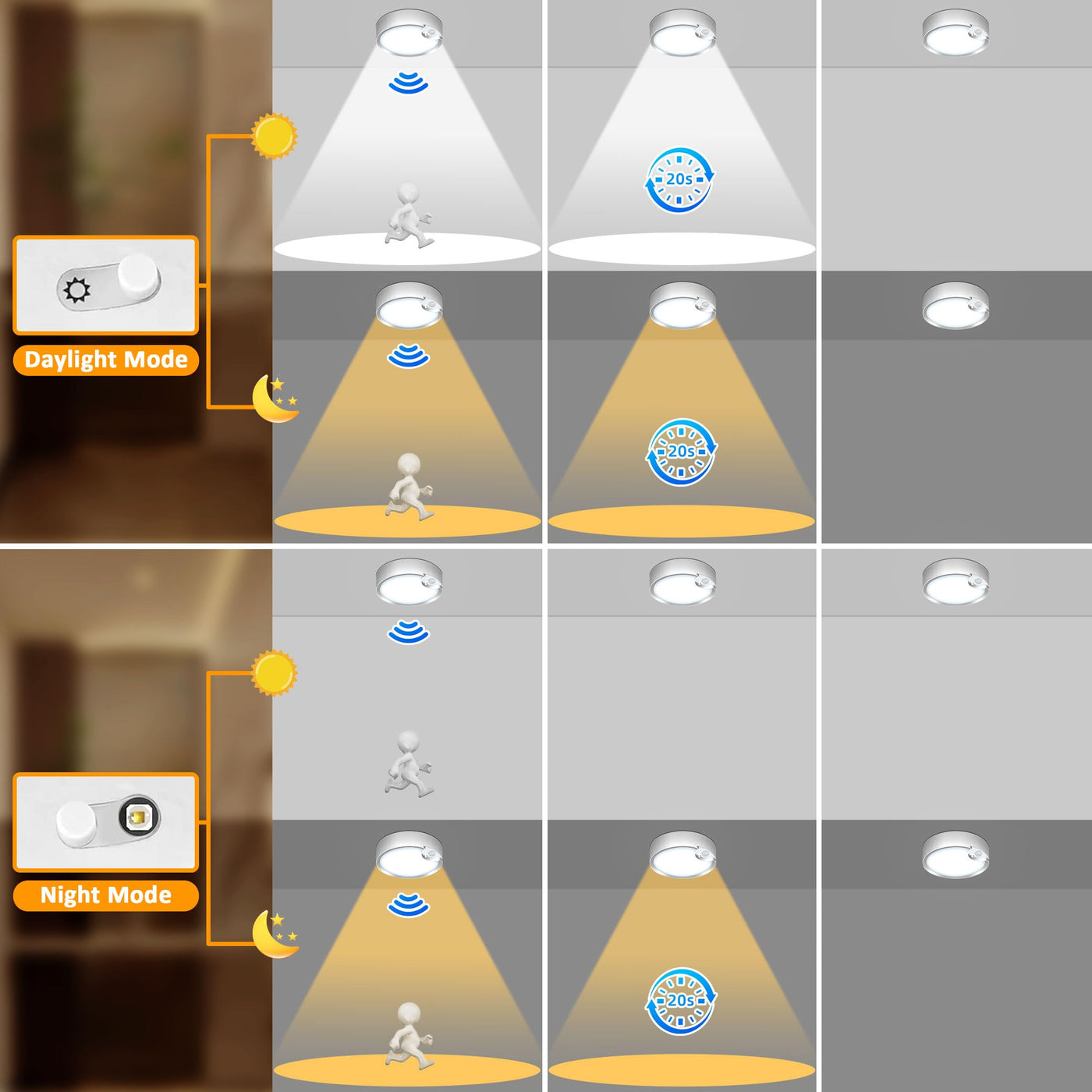 Q: How does the motion sensor work on the Yurnero Battery Operated Ceiling Light?A: The Yurnero Battery Operated Ceiling Light features a built-in motion sensor that activates the light automatically when it detects motion within an 18-foot range. This function helps to conserve battery life by turning off the light after 20 seconds of no detected movement.
