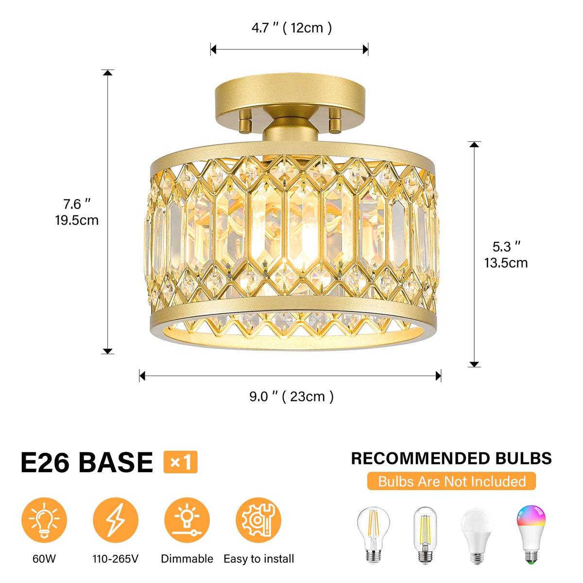 YURNYQ Crystal Ceiling Light Fixture, Modern Semi Flush Mount, 9.05in, Gold, Metal, Model 241017001