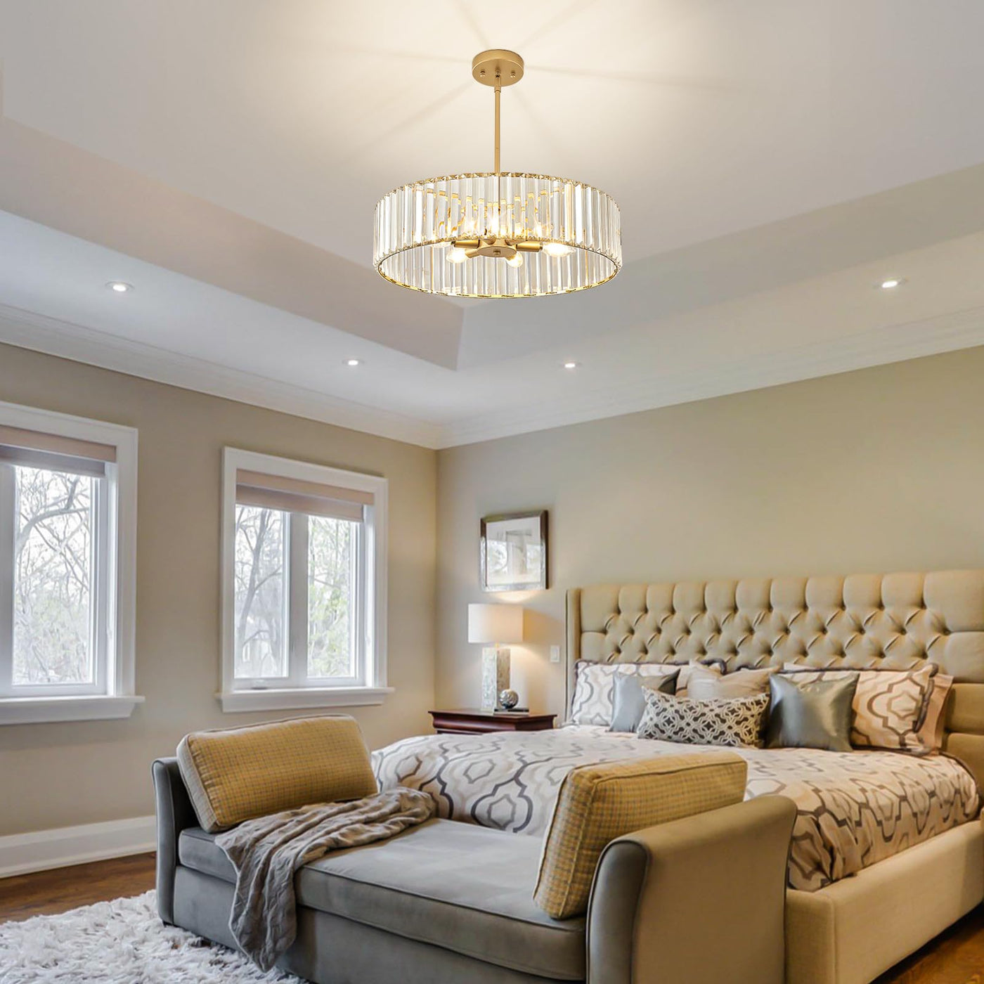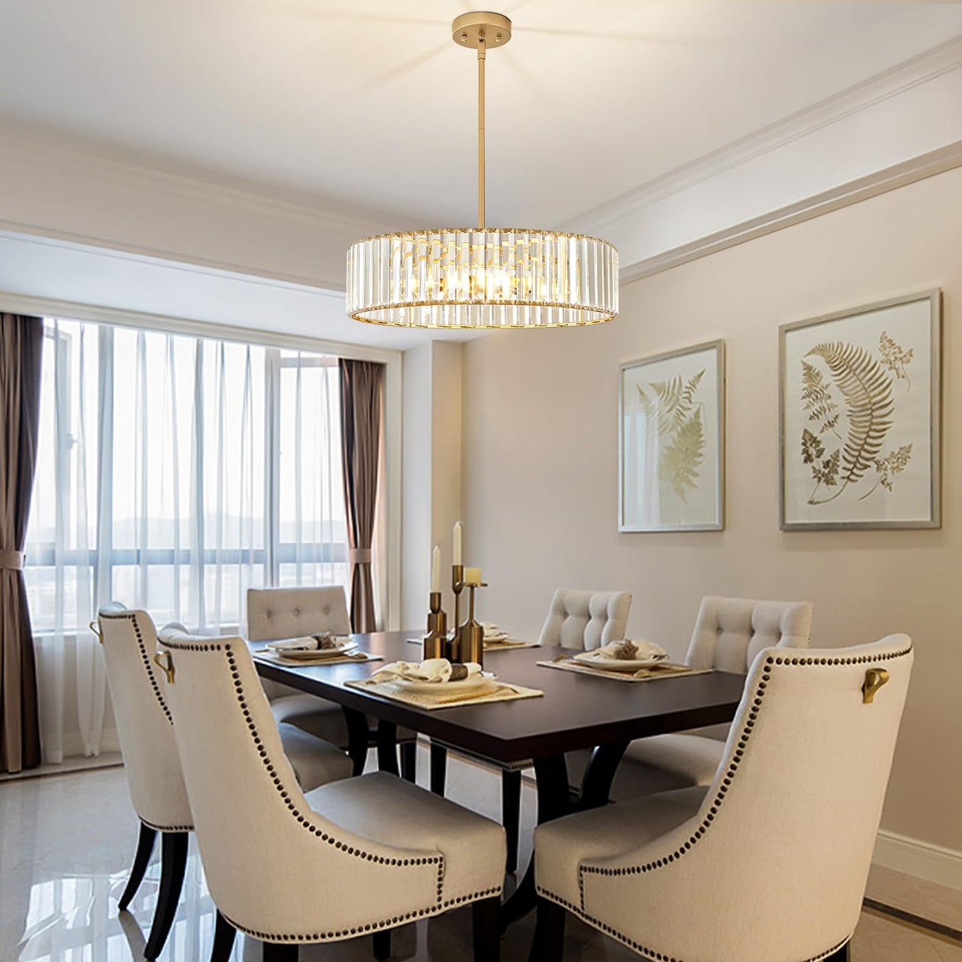 Gold crystal chandelier: modern elegant dining room chandelier light fixtures Input Voltage: 120V AC A glamorous crystal chandelier that add substance and dimension to any setting. It features a drum profile layered in shining crystals and a soft gold finish that adds a warm touch. Provides a warm and welcoming aura for a dining area or living room.