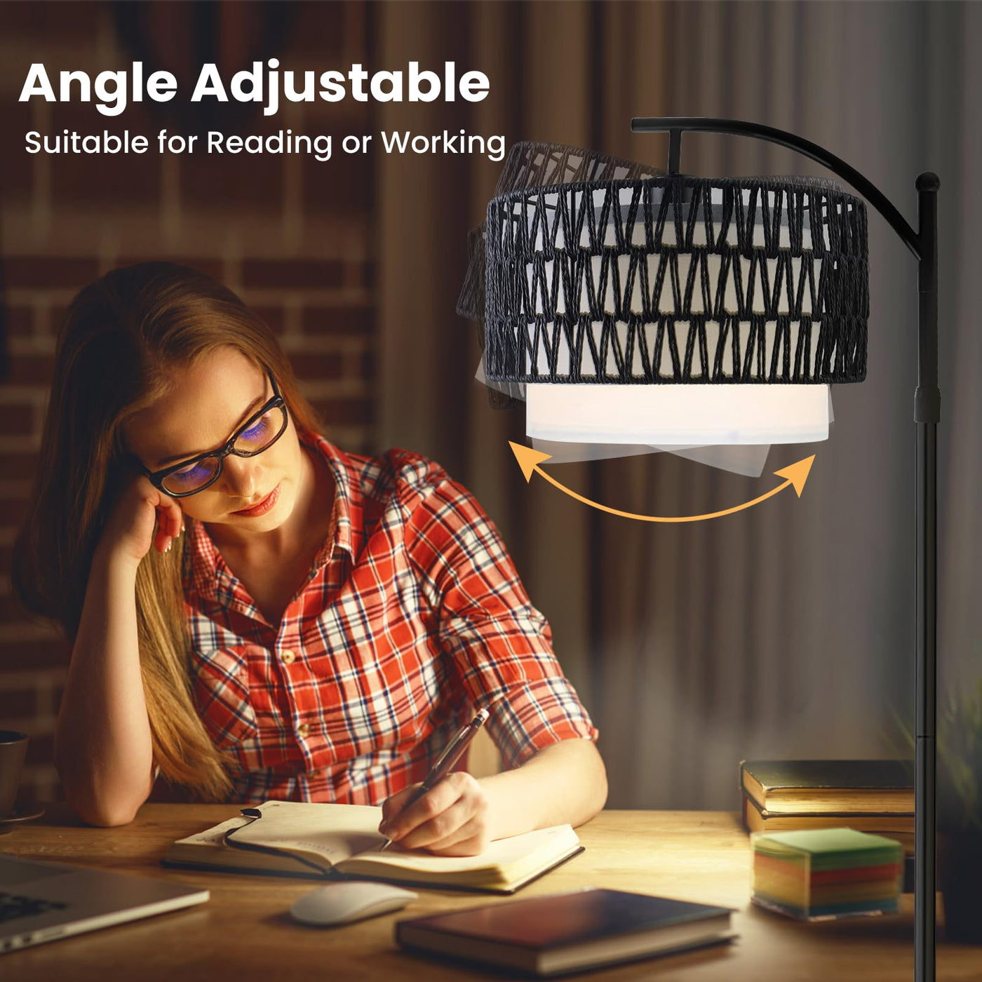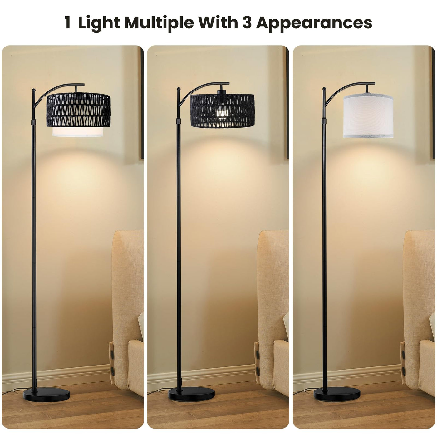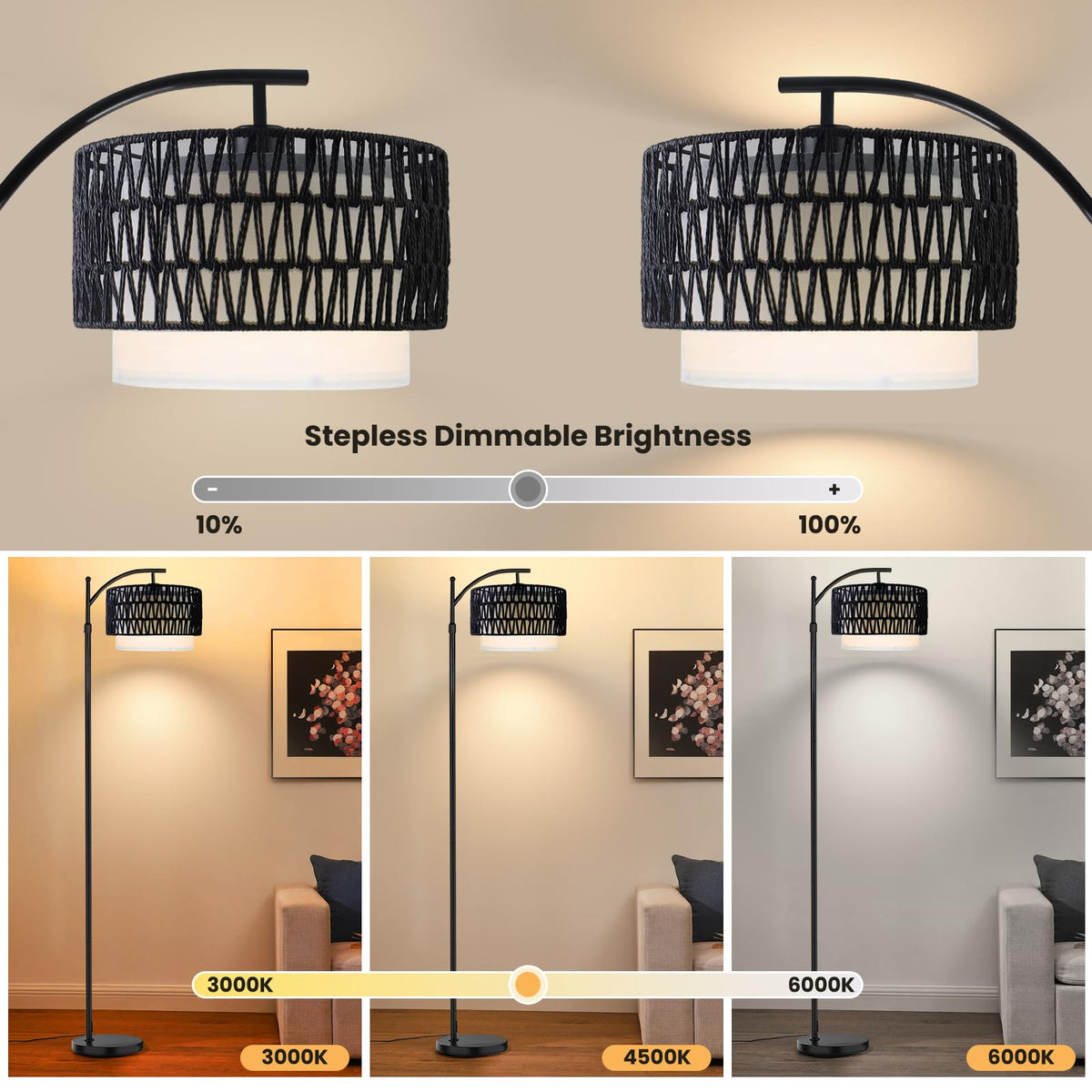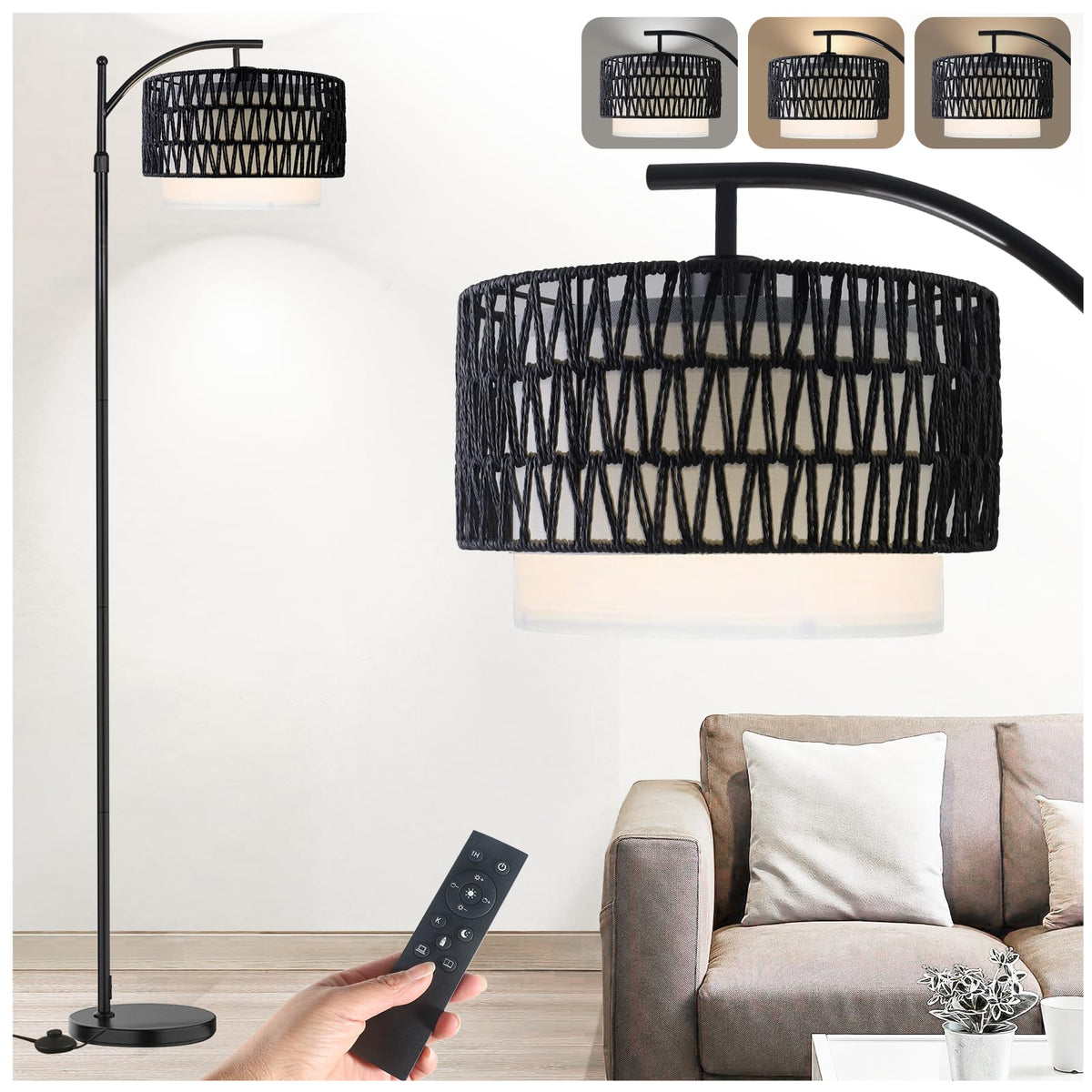 Yusist Arc Floor Lamp For Living Room,Farmhouse Floor Lamps With Remote Control & Dimmable Bulb,Black Rattan Boho Tall Standing