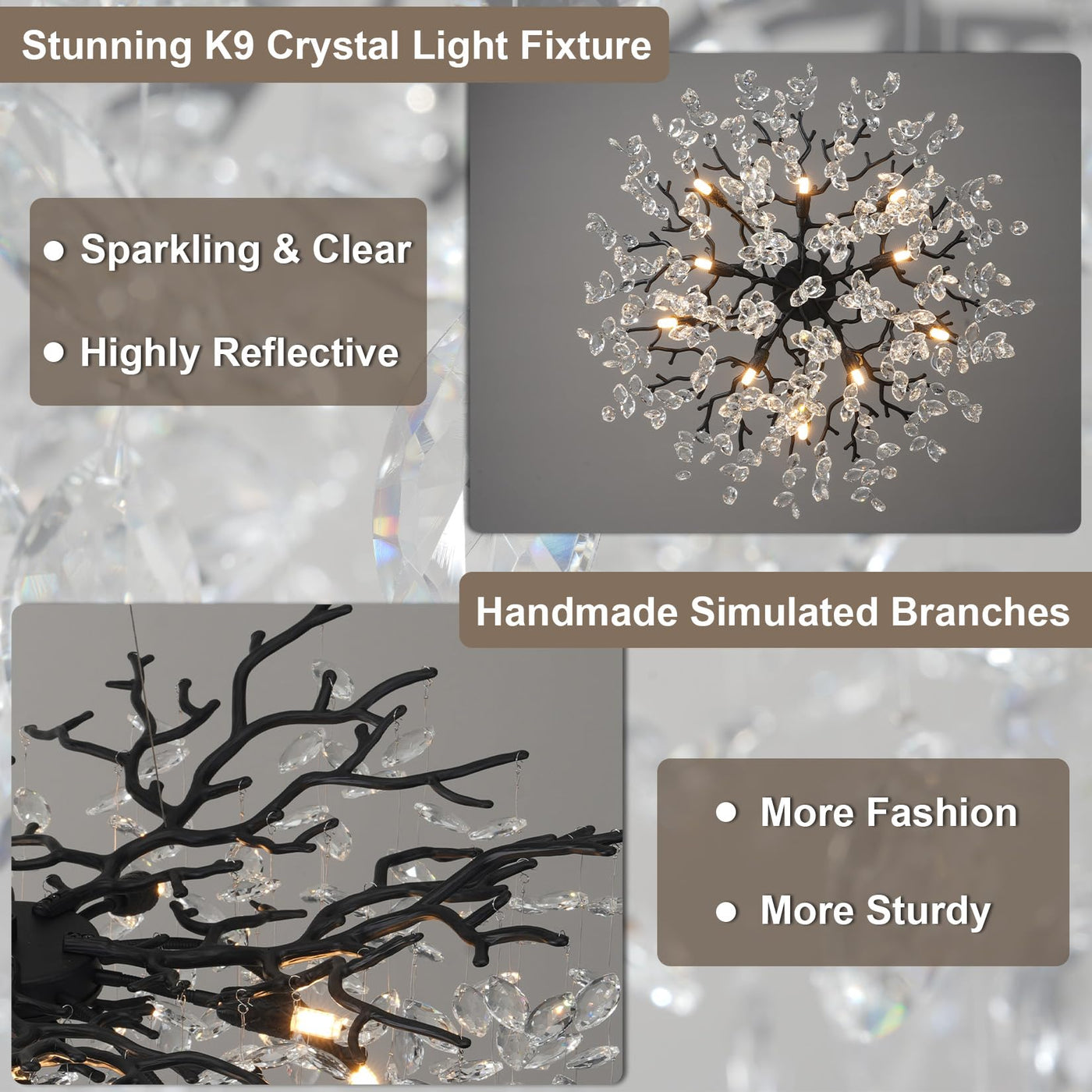 Yuyi Tree Branch Crystal Chandelierthis Chandelier For Dining Room, Inspired By Nature, Is Designed To Resemble Flourishing Branches. It Is Sparkling And Luxurious, Symbolizing Abundance In Love, Career, Family, And Friendship. The Chandelier Is Crafted With Exquisite Black Decorative Branches And 100% Top K9 Crystals That Are Pure, Romantic, And Shimmer Like Diamonds. The Entire Fixture Presents A Natural Artistic Beauty When Illuminated.Features:Its Metal Construction Is Hang-Forged By Our Artisan Blacksmiths And Covered With A Luxurious Frosted Finish. Branches Drip With Hand Blow Glass Teardrops That Reflect Light Across Your Room.Installable On Sloped Or Flat Ceilings. Capable Of Being Dimmed With Compatible Dimmable Bulbs (Not Included).The Chandelier Creates A Romantic Atmosphere. It Can Help To Decorate Your Home And Add A Comfortable Ambiance. It Is Perfect For Your Living Room, Bedroom, Dining Room, Hallway, And Guest Room.