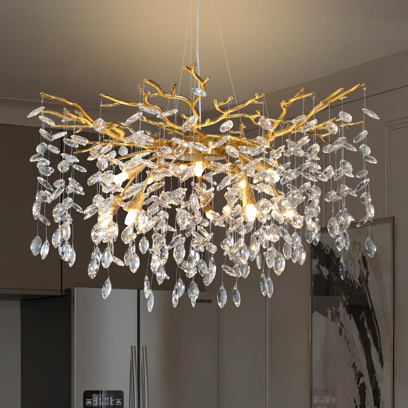 Yuyi Modern Crystal Chandelierthis Chandeliers For Dining Room, Inspired By Nature, Is Designed To Resemble Flourishing Branches. It Is Sparkling And Luxurious, Symbolizing Abundance In Love, Career, Family, And Friendship. The Chandelier Is Crafted With Exquisite Golden Decorative Branches And Stunning K9 Transparent Crystals That Are Pure, Romantic, And Shimmer Like Diamonds. The Entire Fixture Presents A Natural Artistic Beauty When Illuminated.Features:Its Metal Construction Is Hang-Forged By Our Artisan Blacksmiths And Covered With A Luxurious Frosted Finish. Branches Drip With Hand Blow Glass Teardrops That Reflect Light Across Your Room.Hard-Wired.Installable On Sloped Or Flat Ceilings. Capable Of Being Dimmed With Compatible Dimmable Bulbs (Not Included).Adjustable Length.The Chandelier Creates A Romantic Atmosphere. It Can Help To Decorate Your Home And Add A Comfortable Ambiance. It Is Perfect For Your Living Room, Bedroom, Dining Room, Hallway, And Guest Room.
