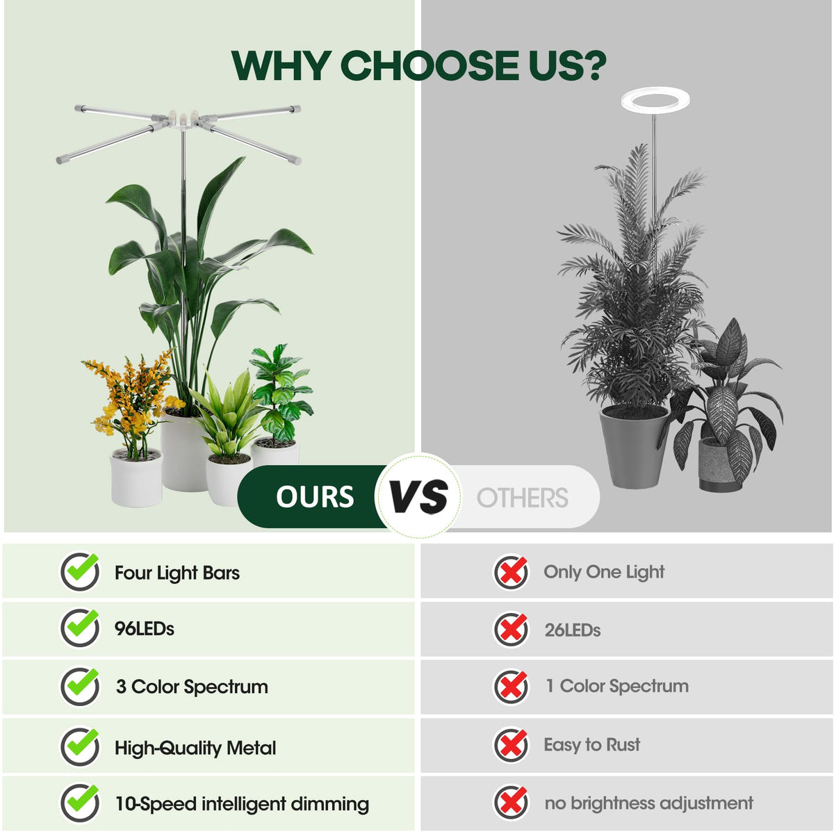 Q: What types of plants can benefit from this grow light?A: This grow light is suitable for all stages of plant growth, whether for small indoor plants or larger ones, thanks to its adjustable height and full spectrum lighting.