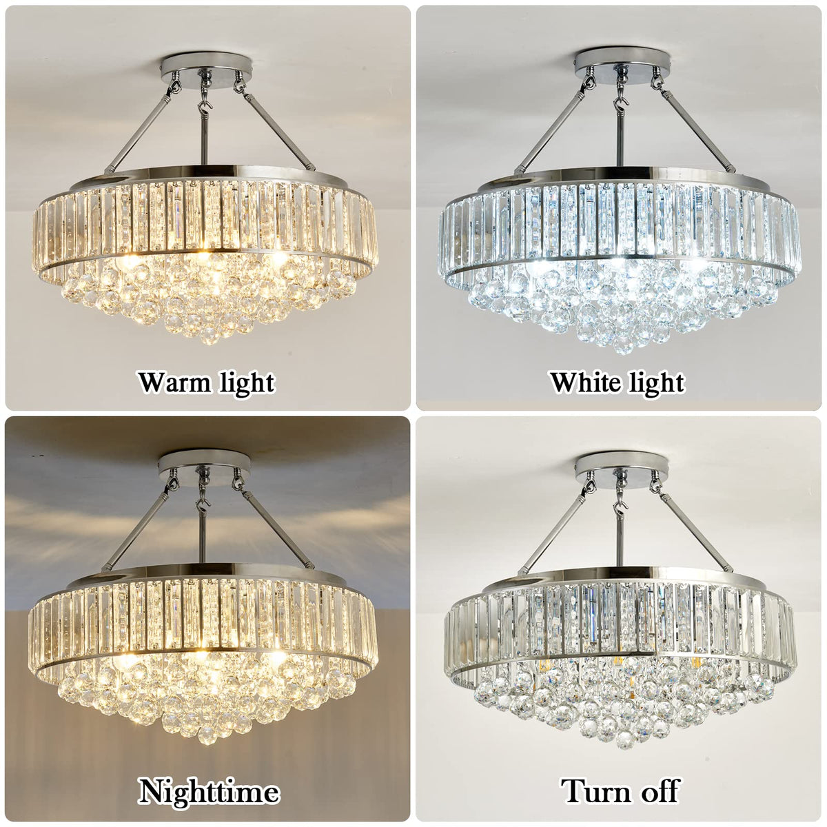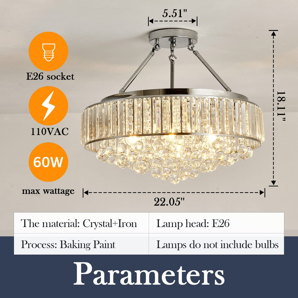Yyjlx 6-Light Modern Round Crystal Chandelier, Chrome Semi Flush Mount Ceiling Light, Silver