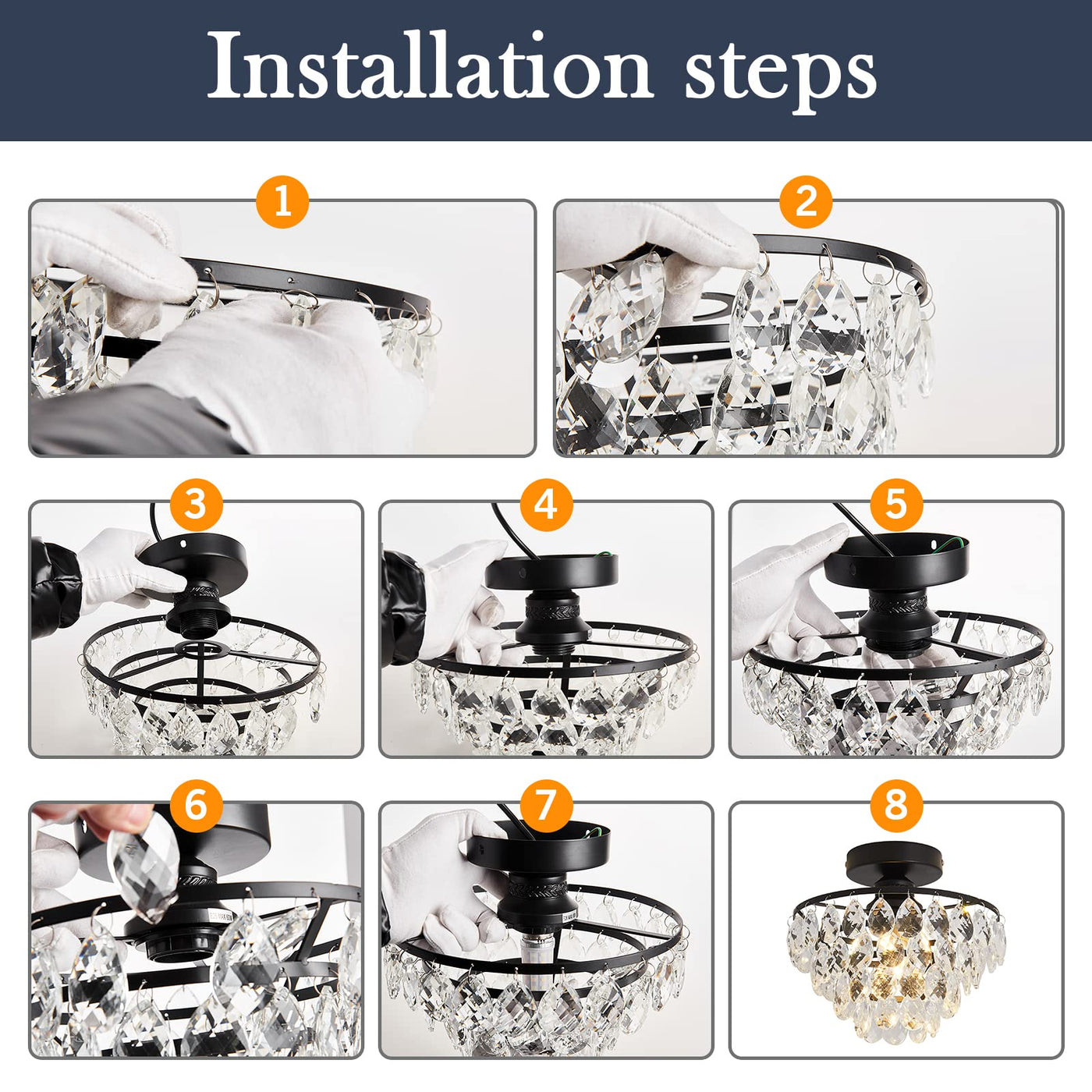 Compact Design: The sparkling crystal of this close to ceiling light fixture has the touch and feel of glass making it unbreakable, and the high-temperature baked metal is less likely to lose paint and oxidize, allowing it to create an atmosphere of contemporary luxury and rustic vintage in your room. | Indoor Ceiling Light size: 9.05 inches high and 9.84 inches wide,Interior lighting for hallway,bedroom,bathroom,closet, bathroom,dining room, living room,balcony. | Comfortable Glow: 110V 60watts; Bulb base: E26. (*Bulbs Not Included* You need to get 1*E26 Led Bulbs depending on the lighting effects you want). | Easy Installation: Assembly required(include hanging the crystal strings to the silver plate), but easy to install and all mounting hardware and a detailed mounting instructional manual included. | Worry-Free Guarantee: Please do not hesitate to contact us if there is any quality issue or you are not happy with your purchase(90 Days Money Back and 2 Years Replacement Warranty).