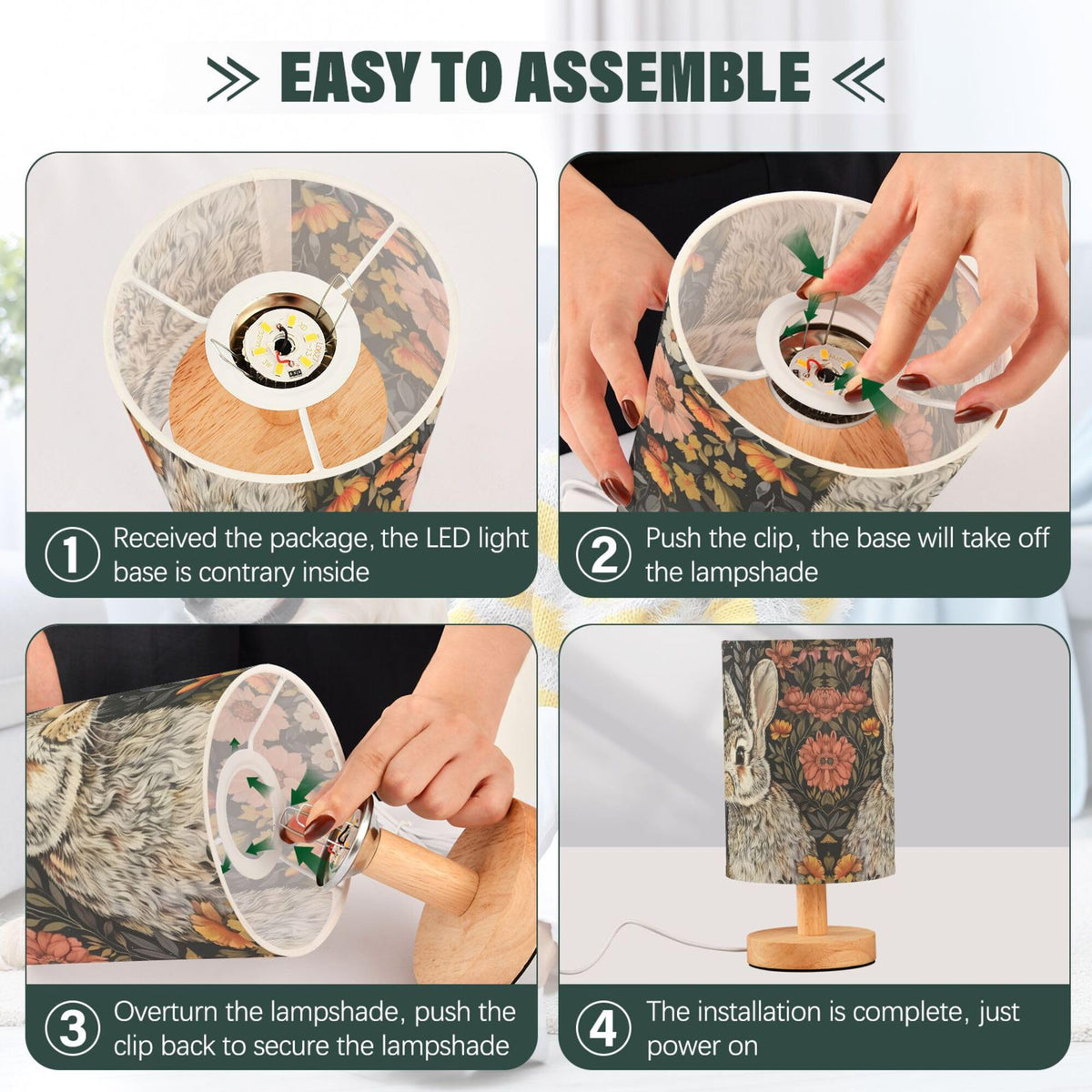 YYZZH Bunny Rabbit Floral Field Table Lamps Night Light Nightstand Lamp With Wood Base Fabric Lamp Shade Bedside Desk Lamp For Nursery Bedroom Living Room Kids Room OfficeSize: 13 cm (diameter of the lampshade) x 24.7 cm / 5.12 inches (diameter of the lampshade) x 9.7 inches; Printing instructions: lampshade printing;Material: linen fabric (lampshade) + LED light (no light bulb) with wooden base + USB button line (non-demolition);Feature: the table lamp includes a lampshade, no need to install a light bulb, the LED light is integrated with the stable wooden base, a short-end button switch, which is convenient for you to turn on or turn off the lights, USB interface, plug and use the desk lamp; Non-flashing warm lights protect your children and family's eyes;Applicable scene: suitable for bedrooms, guest rooms, living rooms, study, boy's and girls' rooms, offices, desks, etc;Instructions for usage: ?The lamp holder and the lampshade for reverse packaging, you need to separate them first; ?Press down the center buckle to separate the lamp seat and the lampshade; ?Press the lampshade center buckle into the ring, then the install is complete; ?Control USB to the power supply and control the button switch.
