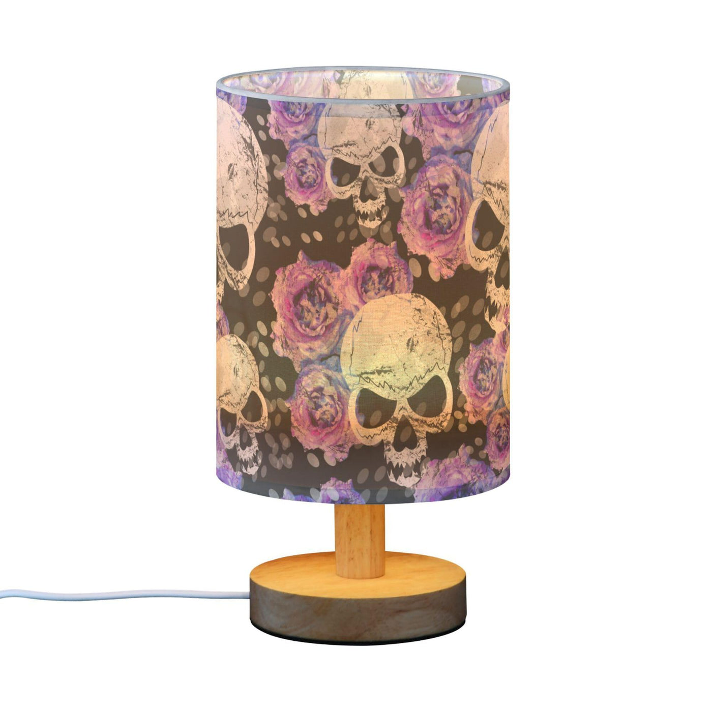 Yyzzh Table Lamp Watercolor Skull Purple Blue Rose Flower Floral Gothic Pattern Nightstand Lamp With Wood Base Fabric Lamp Shade