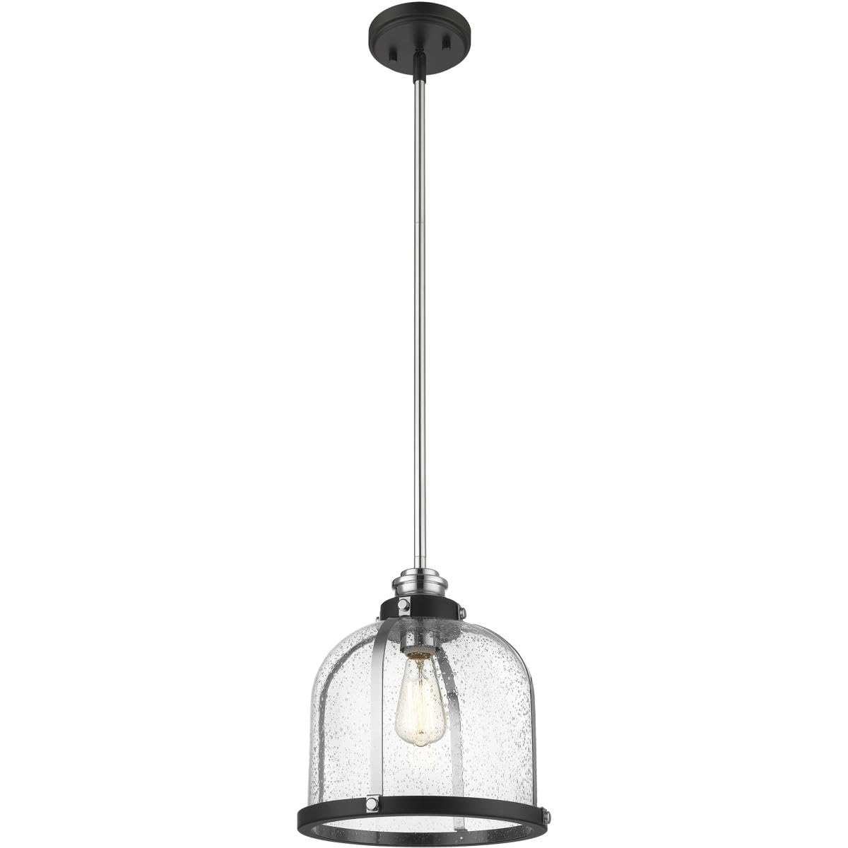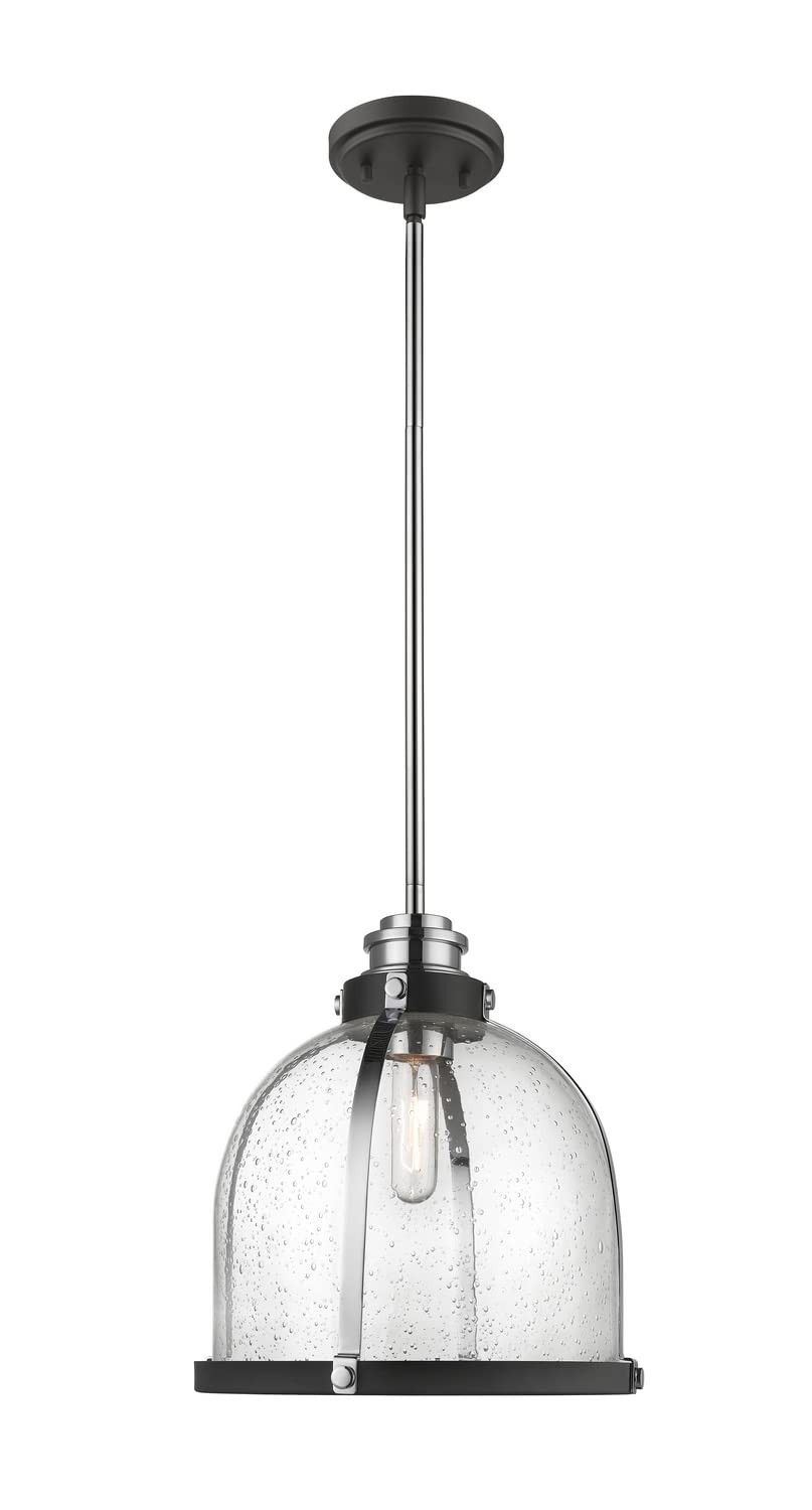 Add character to your dining or living space with this stunning one-light pendant from Z-Lite. Featuring a matte black and chrome finish, this fixture seamlessly blends industrial design with modern elegance. The ethereal seedy glass shade creates a captivating focal point, making it an ideal choice for any room.
