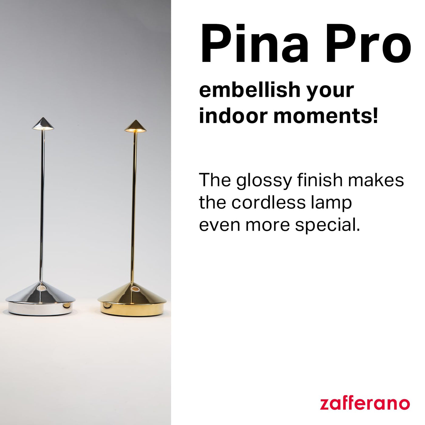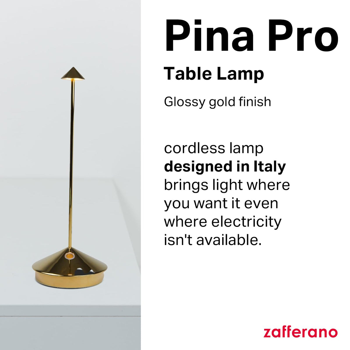 Q: What are the key features of the Zafferano Pina Pro Lamp?A: The Zafferano Pina Pro Lamp features a sleek and elegant design with a glossy gold finish, touch controls for easy operation, and a rechargeable battery that provides over 12 hours of illumination. It also offers three adjustable color temperatures (2200K, 2700K, and 3000K) and is designed for indoor use only.