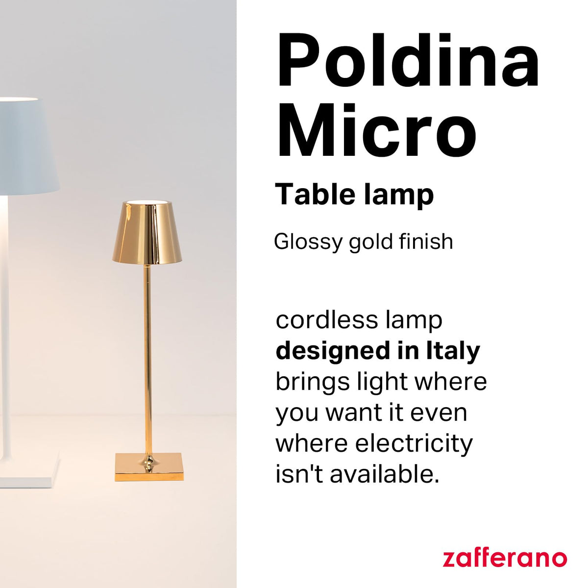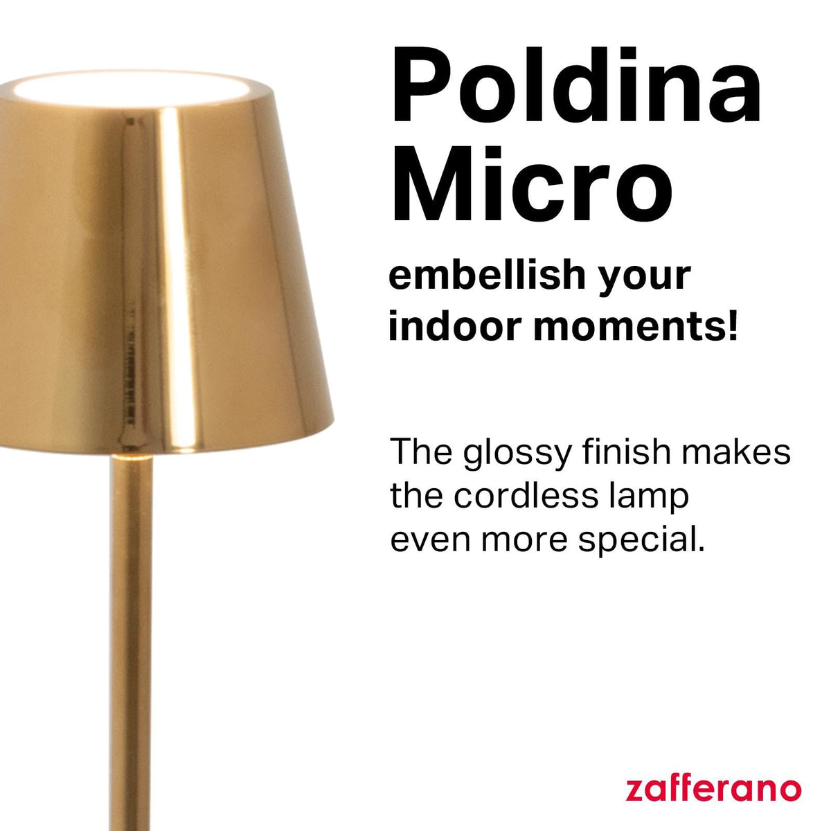 Zafferano, Poldina Micro Lamp With Glossy Gold Finish, Rechargeable Cordless Table Lamp With Touch Controls, Usable As An Indoor