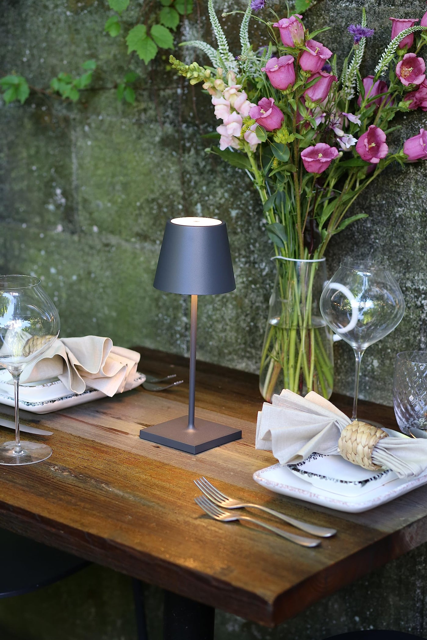 Illuminate any space with the rechargeable and cordless Poldina Pro Mini Lamp by Zafferano, the ideal solution for illuminating any space without the need for a power outlet. This rechargeable and cordless table lamp offers the freedom to bring light wherever it is needed, whether it's a dinner in the garden with friends, an evening of reading on the balcony, or a discreet light under the porch on summer evenings. Additionally, the Poldina Pro Mini can be used as an emergency light during a blackout, ensuring that you won't be left in the dark. The Poldina Pro Mini is equipped with a touch button located on the head of the lamp, which allows you to turn the lamp on/off, adjust the brightness, and select the color temperature of the light between 2200K, 2700K, and 3000K. Thanks to its high protection index (IP65), this lamp is suitable for both indoor and outdoor use, so you can take it with you to the garden, balcony, or terrace to illuminate a dinner or read under the stars. Charging the battery of the Poldina Pro Mini is extremely simple: just place the lamp on the innovative contact charging base to complete the charge in 6-7 hours. Once fully charged, the battery has a lifespan of over 12 hours, allowing you to enjoy an evening with friends, a dinner, or reading a good book without worrying about being left in the dark. Furthermore, thanks to the electronic control system that monitors the remaining battery life, it is possible to optimize the charges and avoid overcharging. The batteries are replaceable when they reach their end of life (typically after 500 charges).